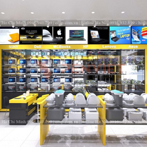 Hệ thống quầy kệ sử dụng cũng được thiết kế đặc biệt để phù hợp với những sản phẩm buôn bán. Hệ quầy kệ sát tường kết hợp giữa chất liệu gỗ và cửa kính để trưng bày sản phẩm điện tử như máy ảnh, máy tính. Hệ quầy kệ bên đối diện là những quầy kệ sát tường kệ treo để trưng bày sản phẩm máy lạnh, tivi… Còn tủ kệ trưng bày giữa nhà được sử dụng để trưng bày sản phẩm như nồi cơm điện, lò vi sóng, ấm điện.