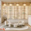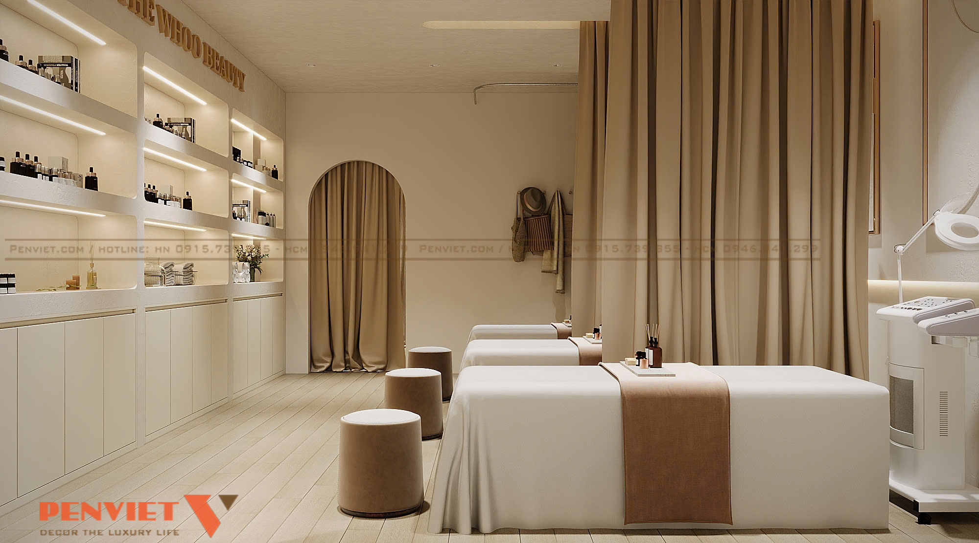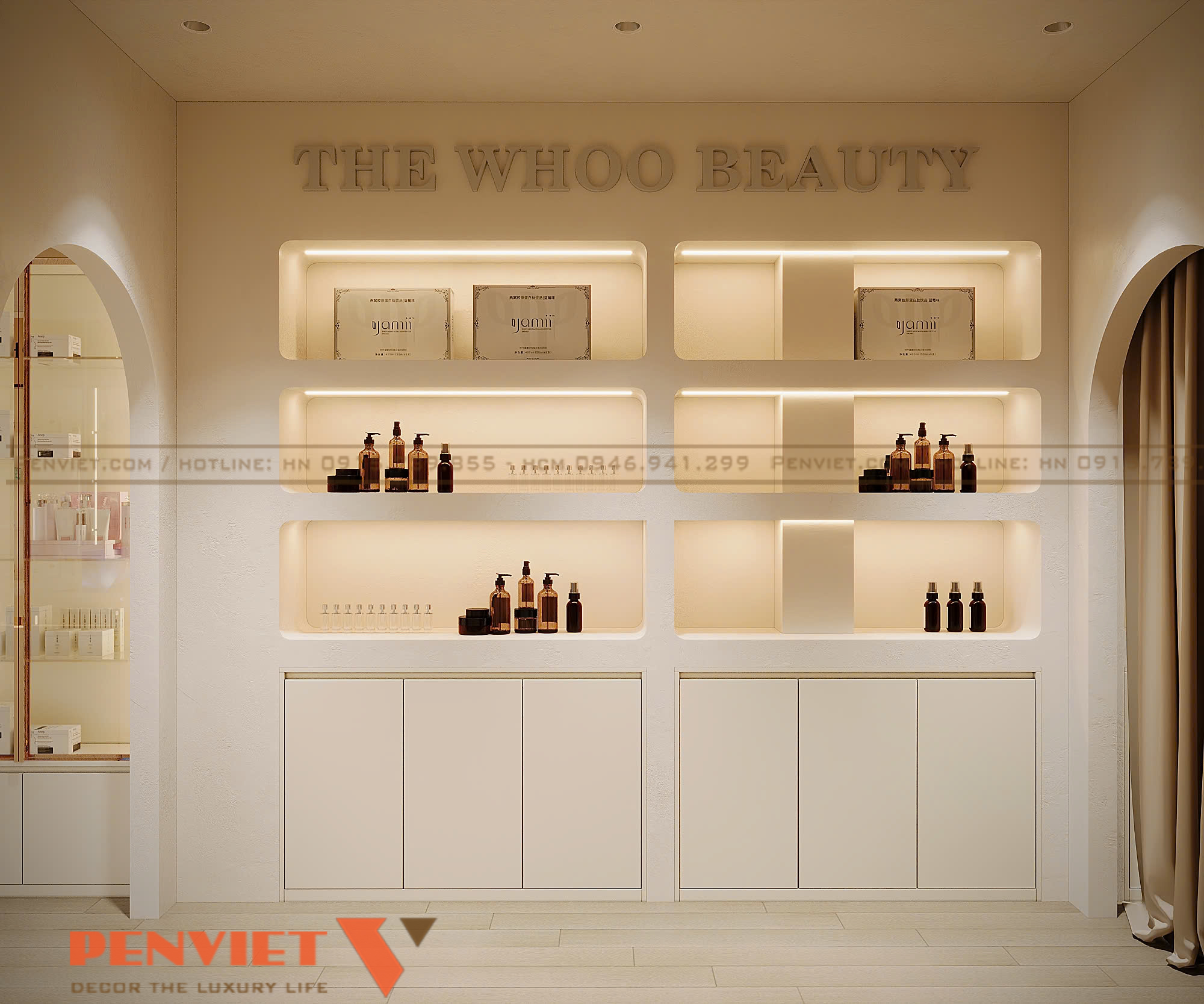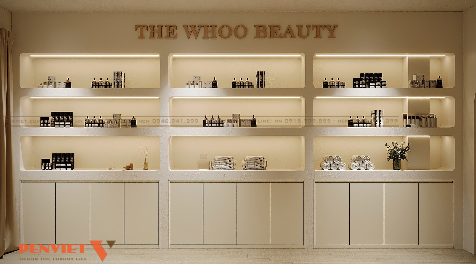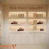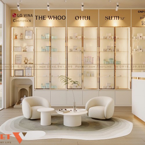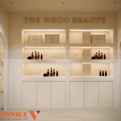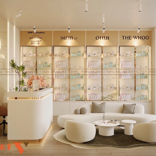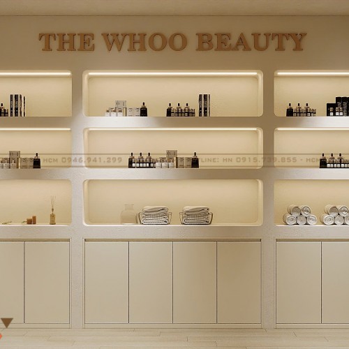 Một điểm mạnh nổi bật của dự án Hoài Thu Spa là sự kết hợp hài hòa giữa spa chăm sóc da và showroom mỹ phẩm chính hãng. Hệ tủ trưng bày được thiết kế âm tường, sử dụng kính trong suốt và khung kim loại sáng màu, giúp sản phẩm trở nên nổi bật hơn. Các thương hiệu mỹ phẩm cao cấp được bố trí rõ ràng, tạo cảm giác chuyên nghiệp và minh bạch.