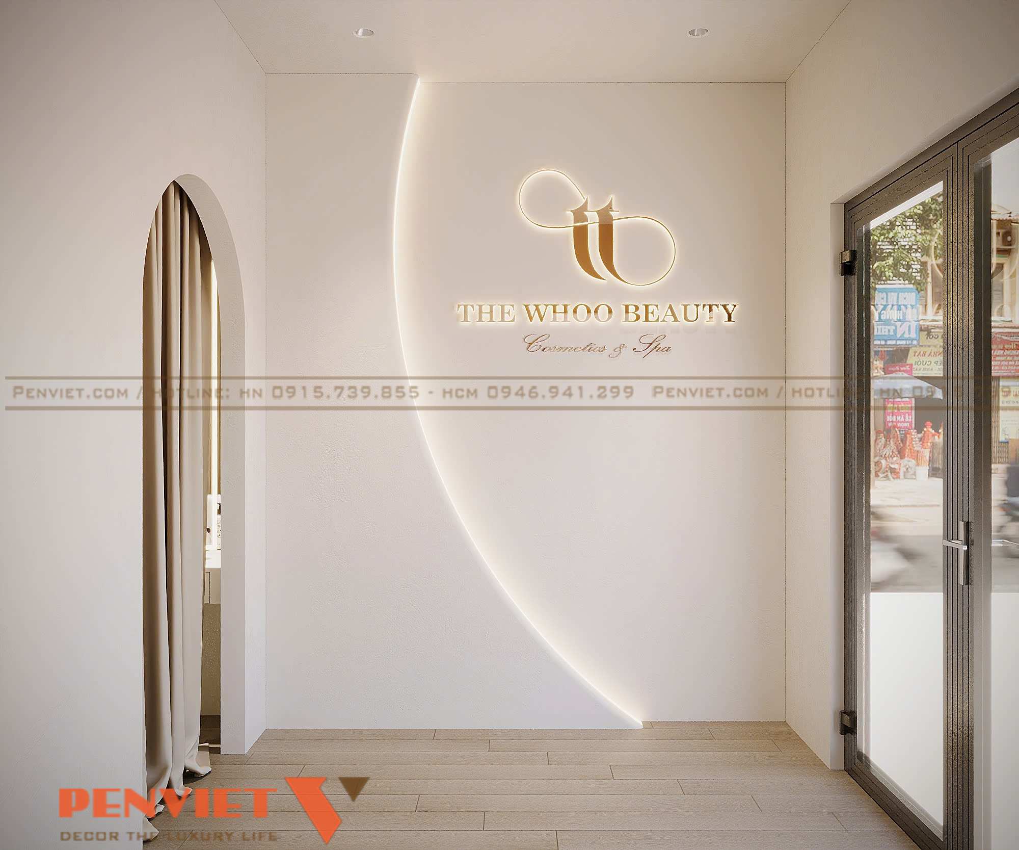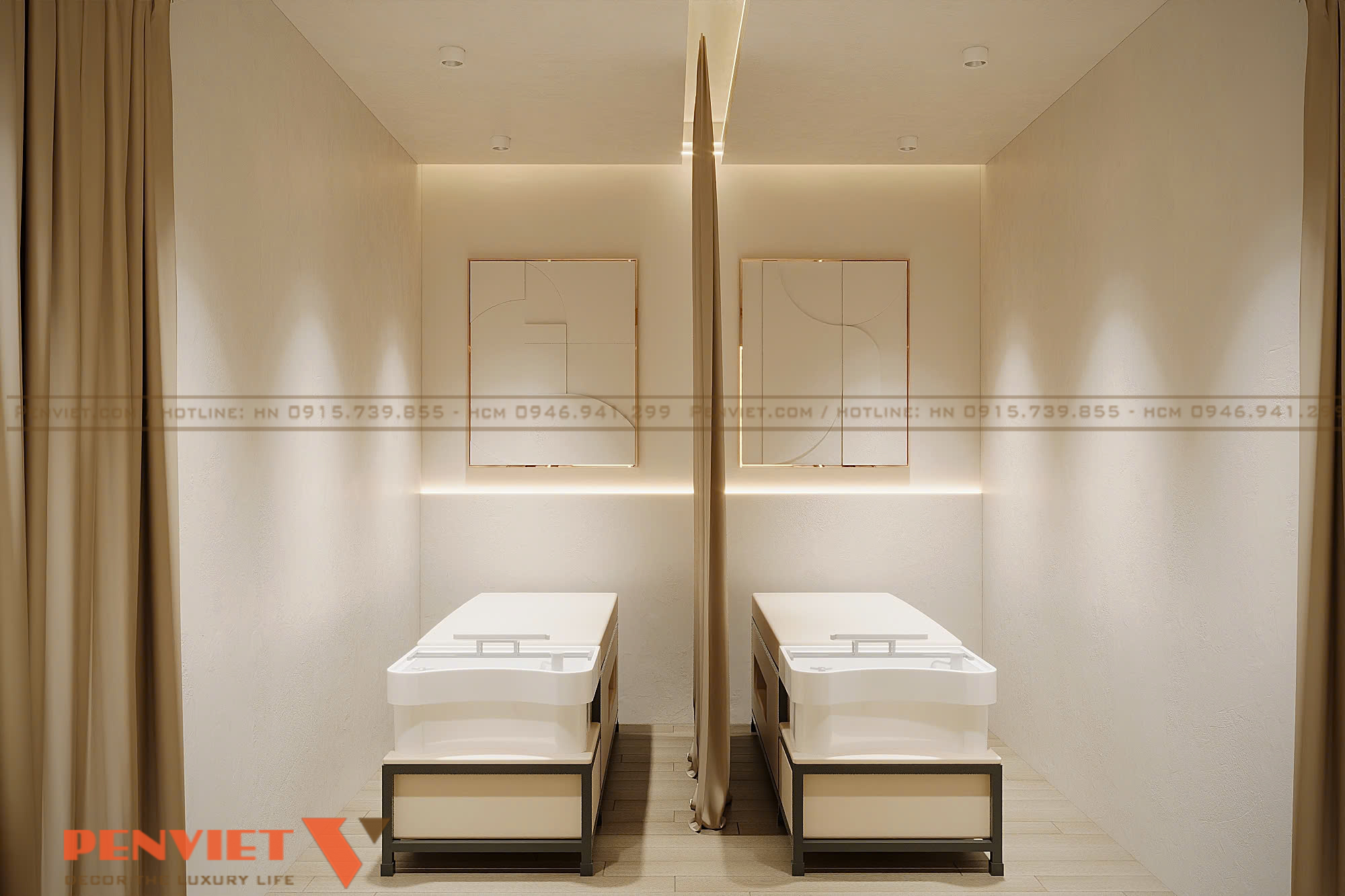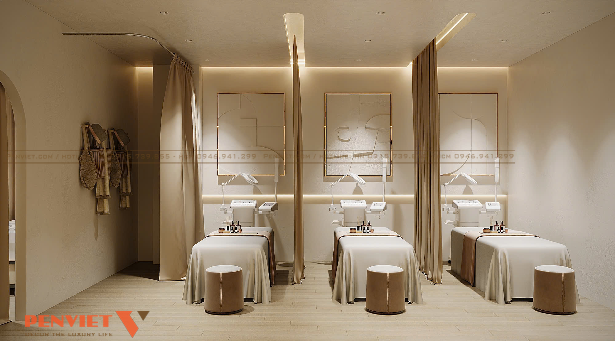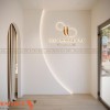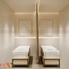 Không gian bên trong được thiết kế đồng bộ với mặt ngoài, hướng đến sự nhẹ nhàng và thư giãn. Tông màu sáng kết hợp ánh sáng vàng dịu giúp khách hàng cảm nhận được sự dễ chịu ngay khi bước vào. Đối với chủ đầu tư spa tại khu đô thị, cách xử lý tổng thể này giúp nâng cao hình ảnh thương hiệu mà không cần diện tích quá lớn.