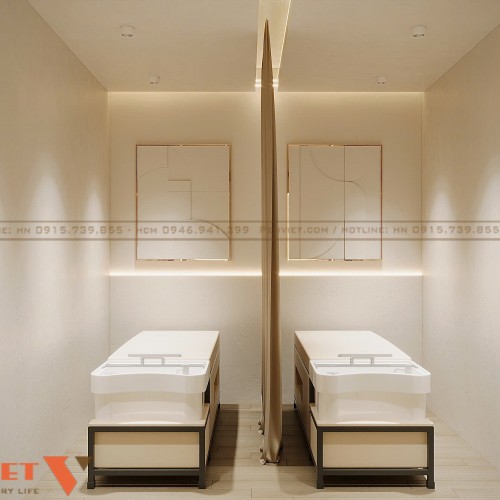 Từ hình ảnh nội thất có thể thấy, các khu vực được phân tách khéo léo bằng bố cục và ánh sáng thay vì vách ngăn cứng. Điều này giúp không gian trở nên rộng rãi hơn so với diện tích thực tế. Với những chủ đầu tư đang cải tạo spa trong nhà liền kề, đây là giải pháp hiệu quả để tối ưu công năng mà vẫn giữ được tính thẩm mỹ.