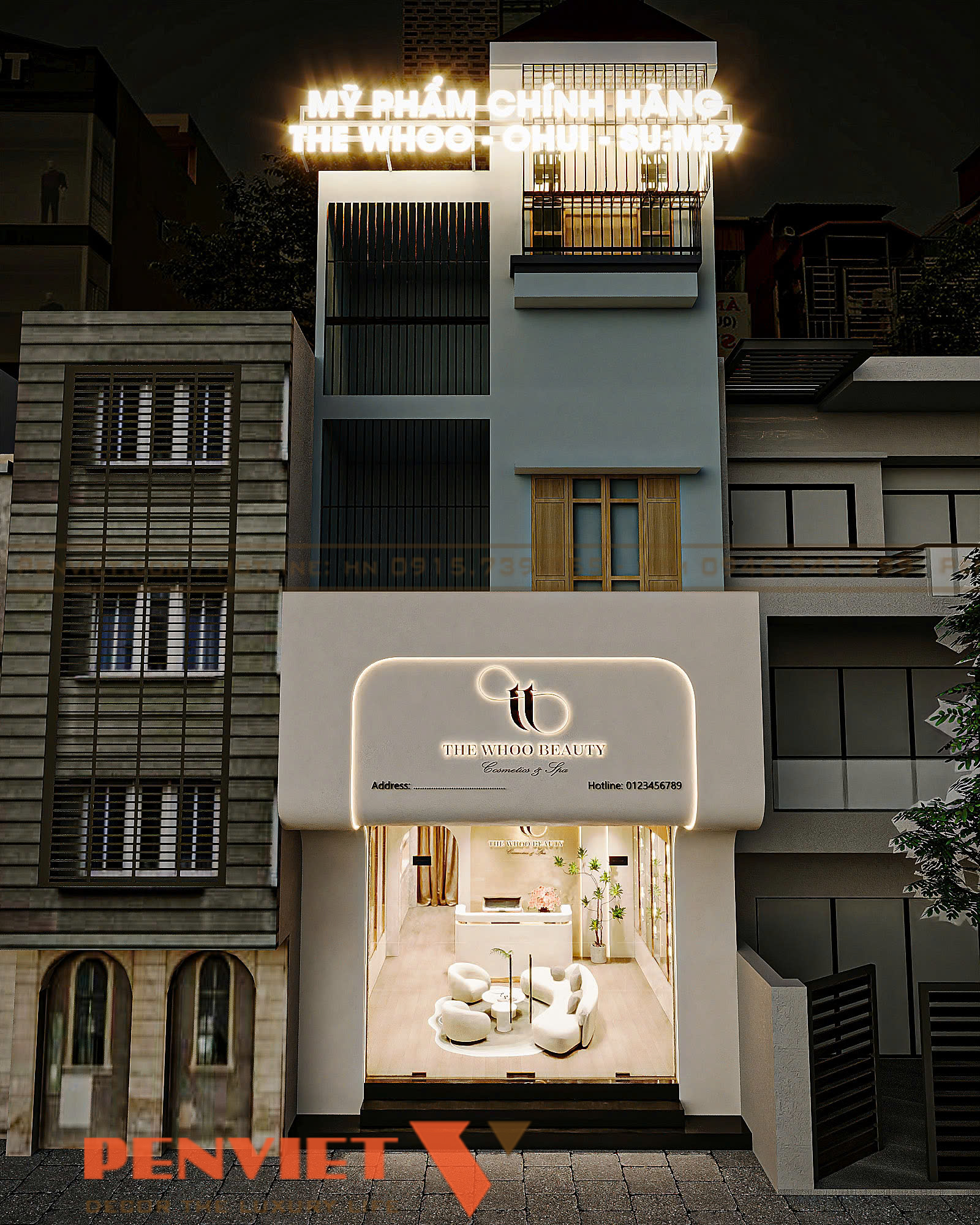 Ngay từ mặt tiền, dự án Hoài Thu Spa đã thể hiện rõ định hướng cao cấp và khác biệt so với các cơ sở làm đẹp lân cận. Thiết kế theo dạng nhà phố giúp tận dụng lợi thế chiều cao, tạo điểm nhấn thị giác mạnh vào ban đêm nhờ hệ thống chiếu sáng thương hiệu. Bảng hiệu nổi bật nhưng được kiểm soát tốt về màu sắc, mang lại cảm giác sang trọng và đáng tin cậy.