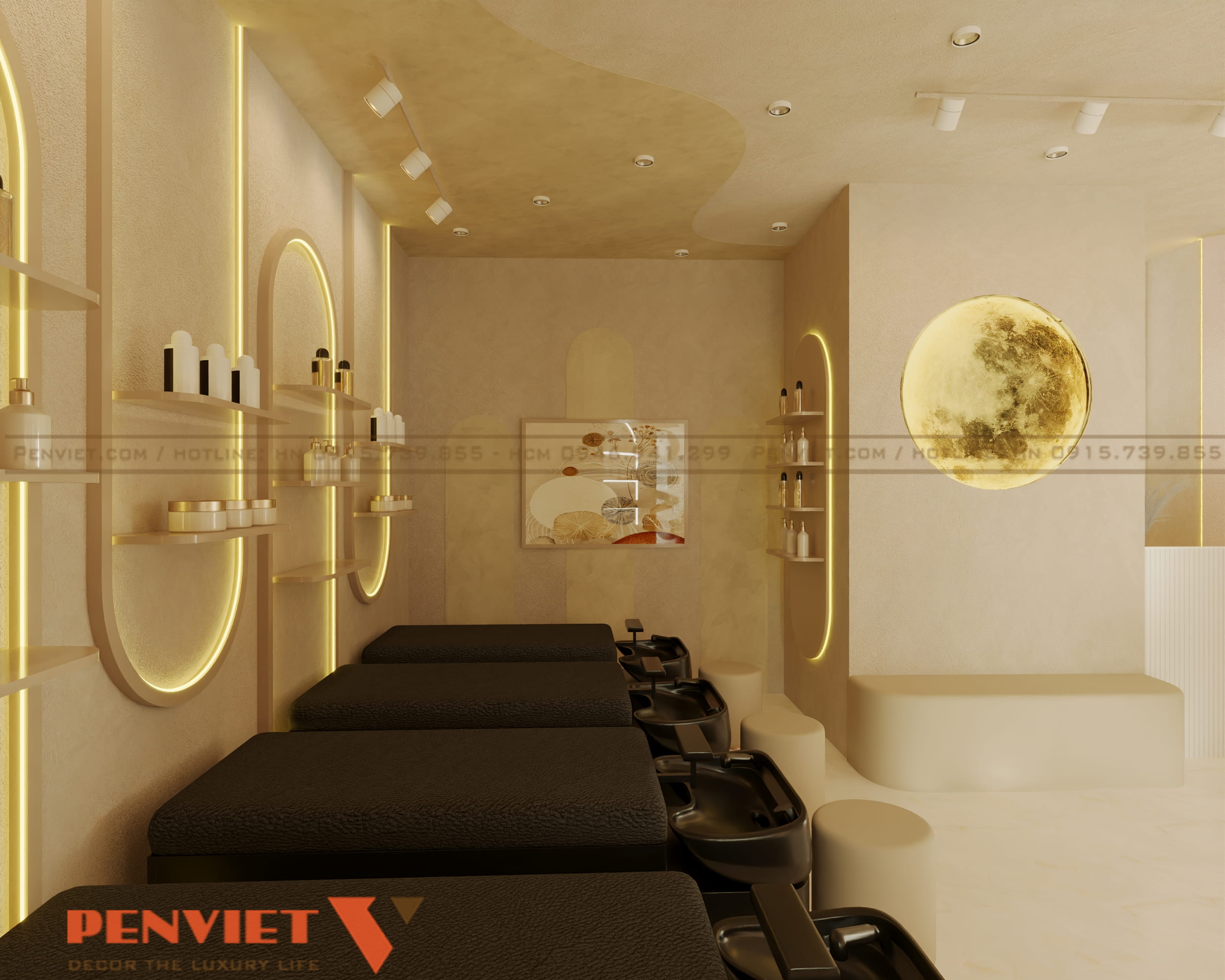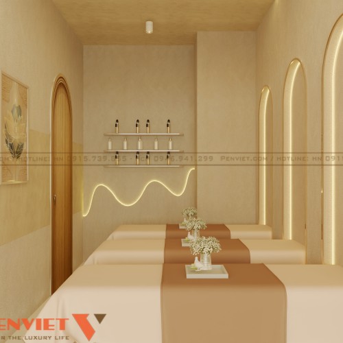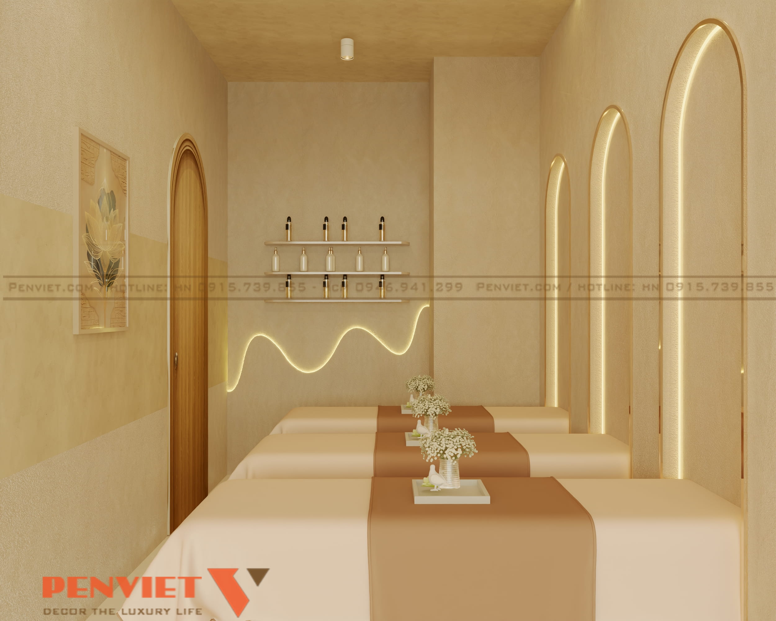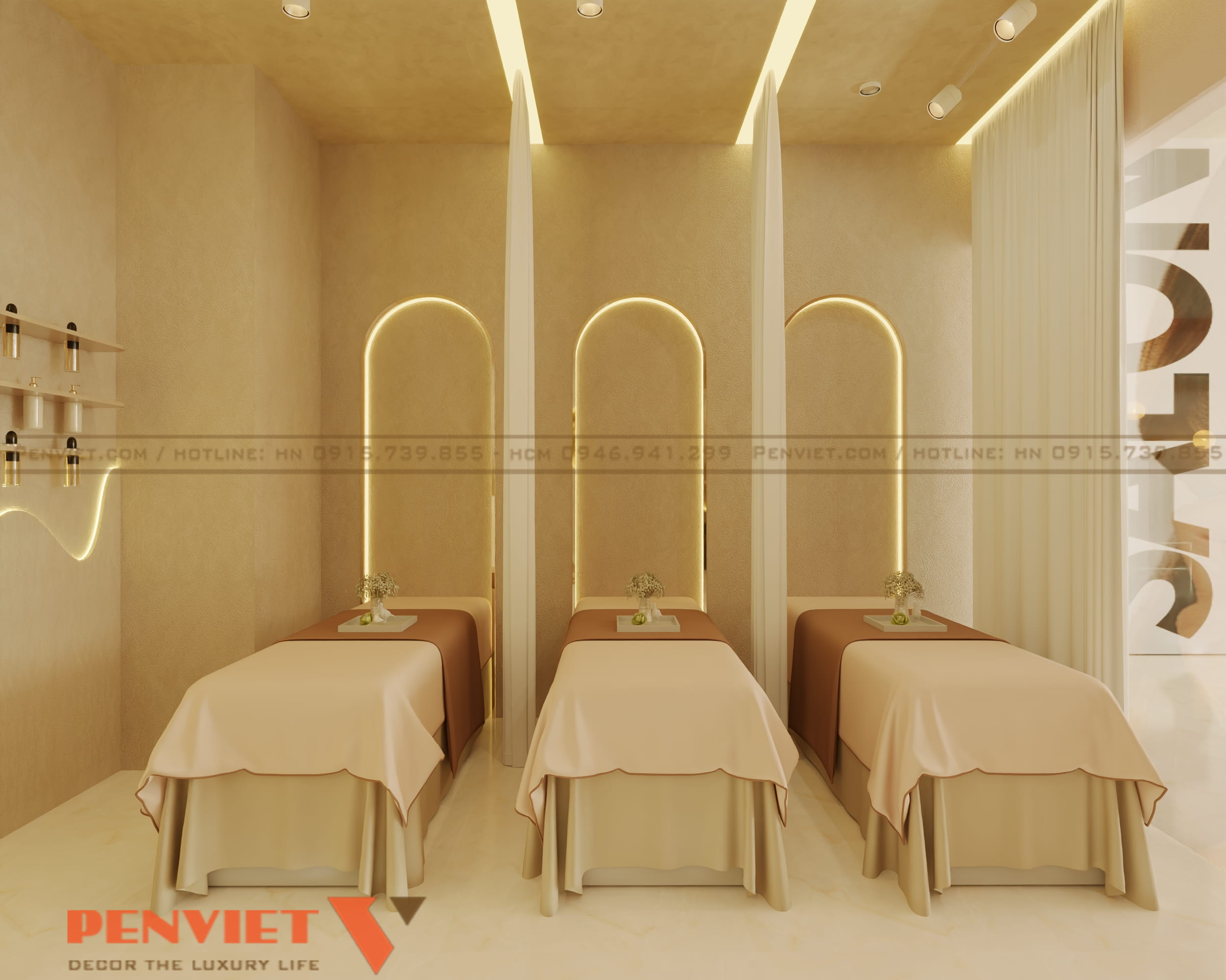 Không gian spa được định hình theo phong cách hiện đại, tối giản nhưng vẫn có điểm nhấn rõ ràng. Gam màu be, kem và ánh vàng được sử dụng xuyên suốt giúp không gian trở nên ấm áp và dễ chịu. Bề mặt tường và trần xử lý mịn, hạn chế chi tiết rườm rà để tạo cảm giác rộng hơn so với diện tích thực.