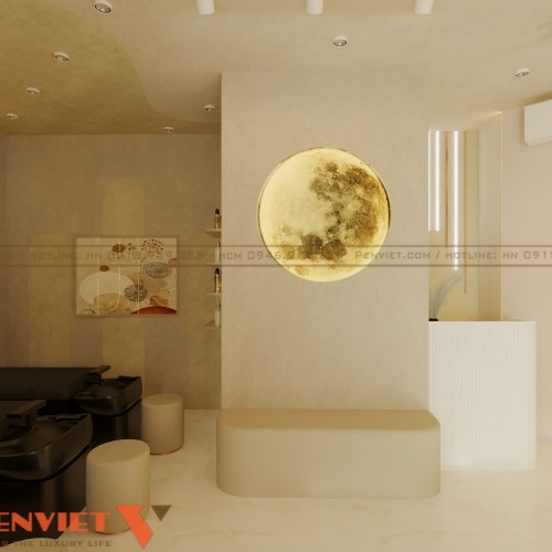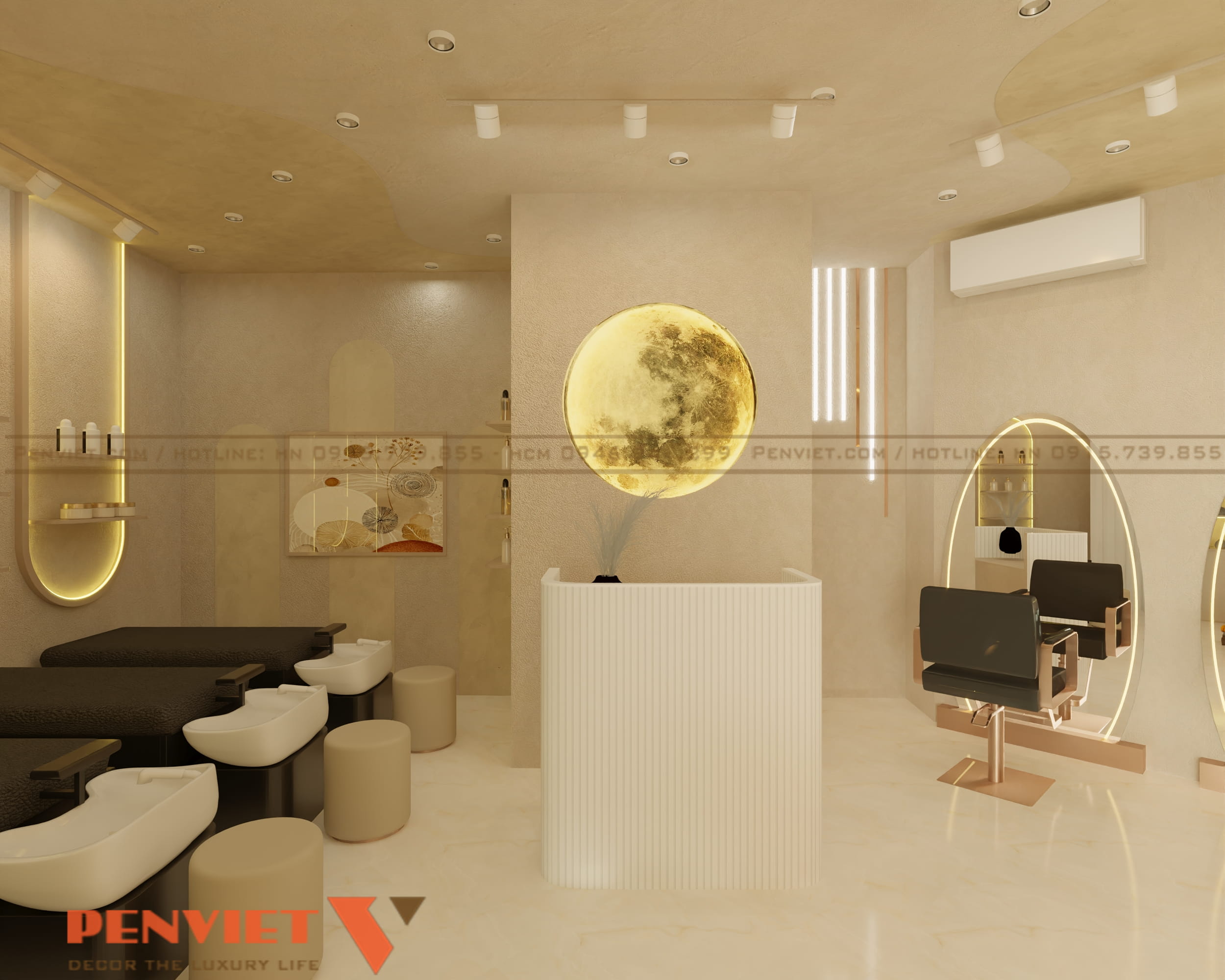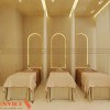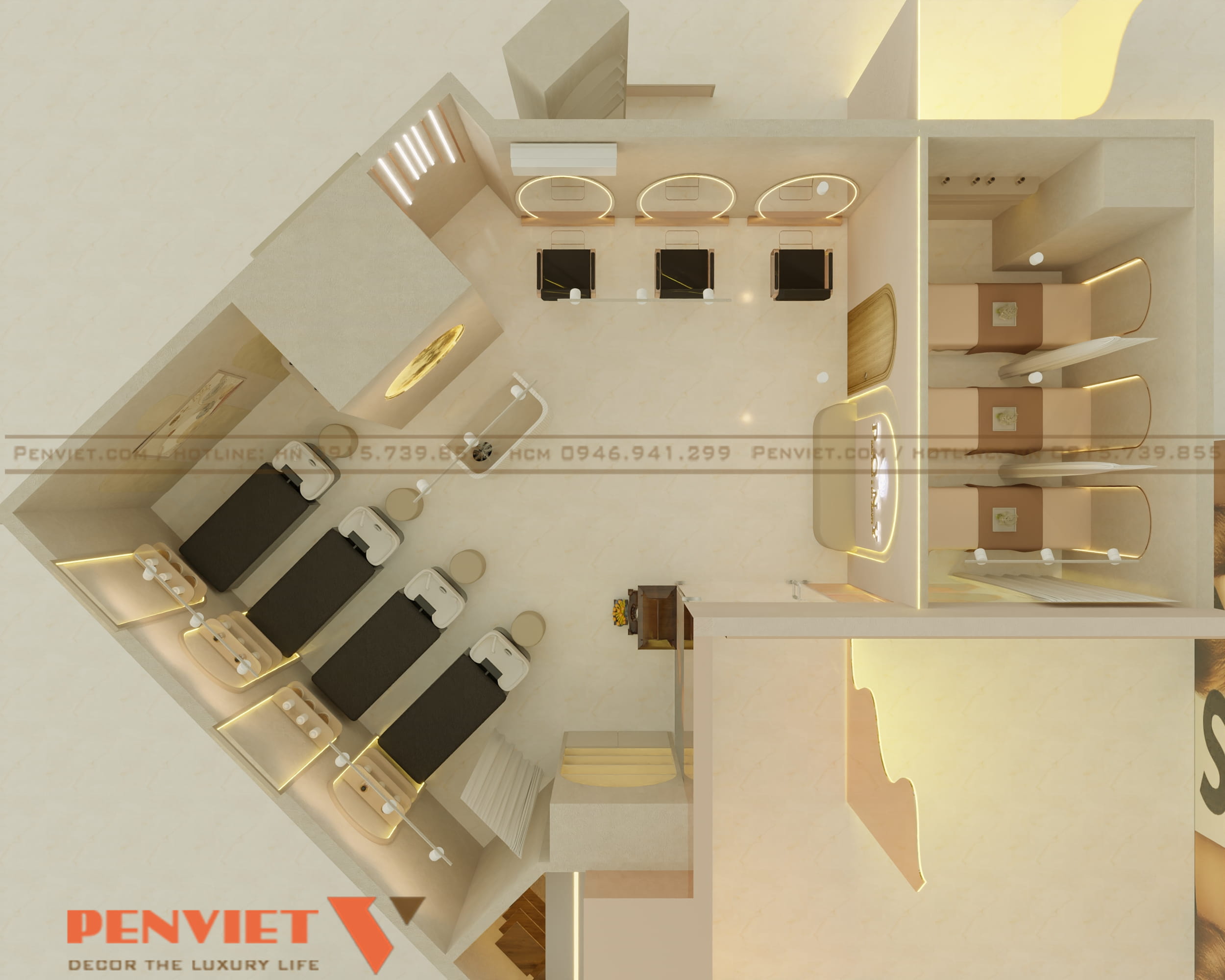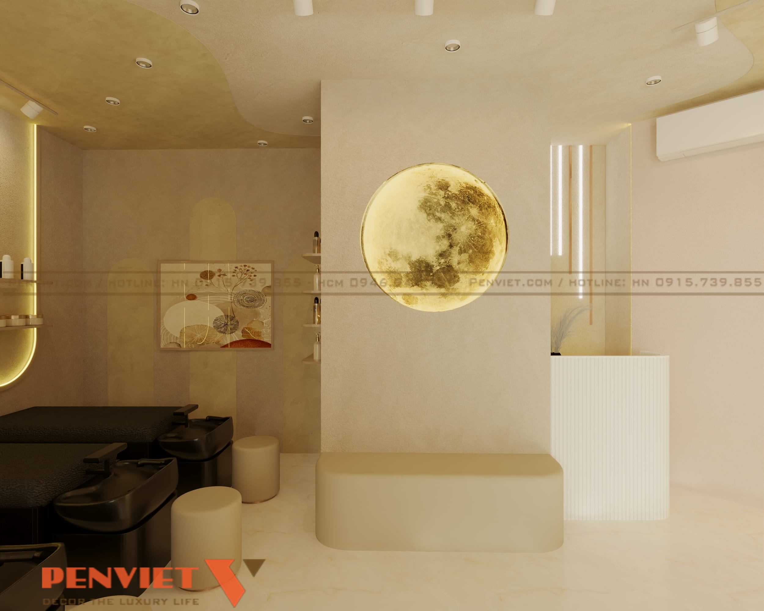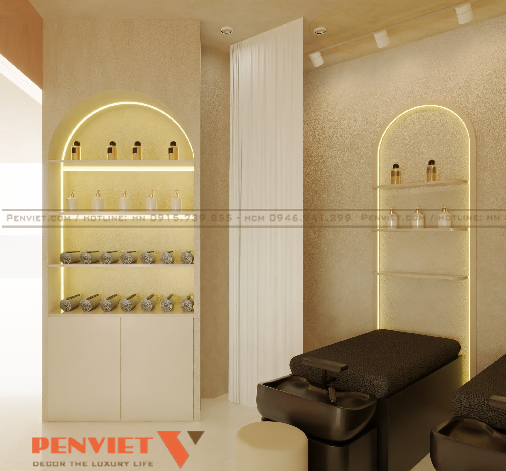Không gian spa được định hình theo phong cách hiện đại, tối giản nhưng vẫn có điểm nhấn rõ ràng. Gam màu be, kem và ánh vàng được sử dụng xuyên suốt giúp không gian trở nên ấm áp và dễ chịu. Bề mặt tường và trần xử lý mịn, hạn chế chi tiết rườm rà để tạo cảm giác rộng hơn so với diện tích thực.