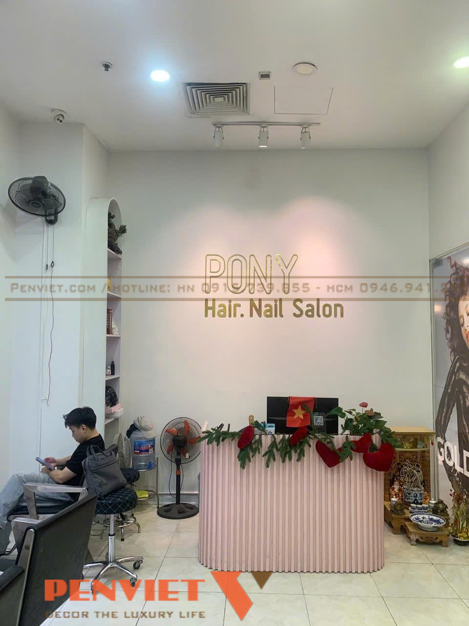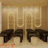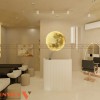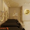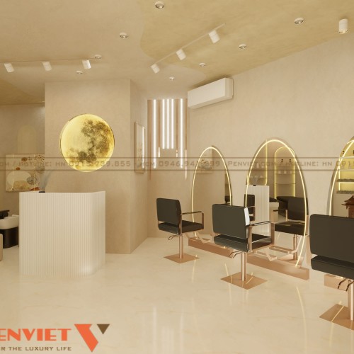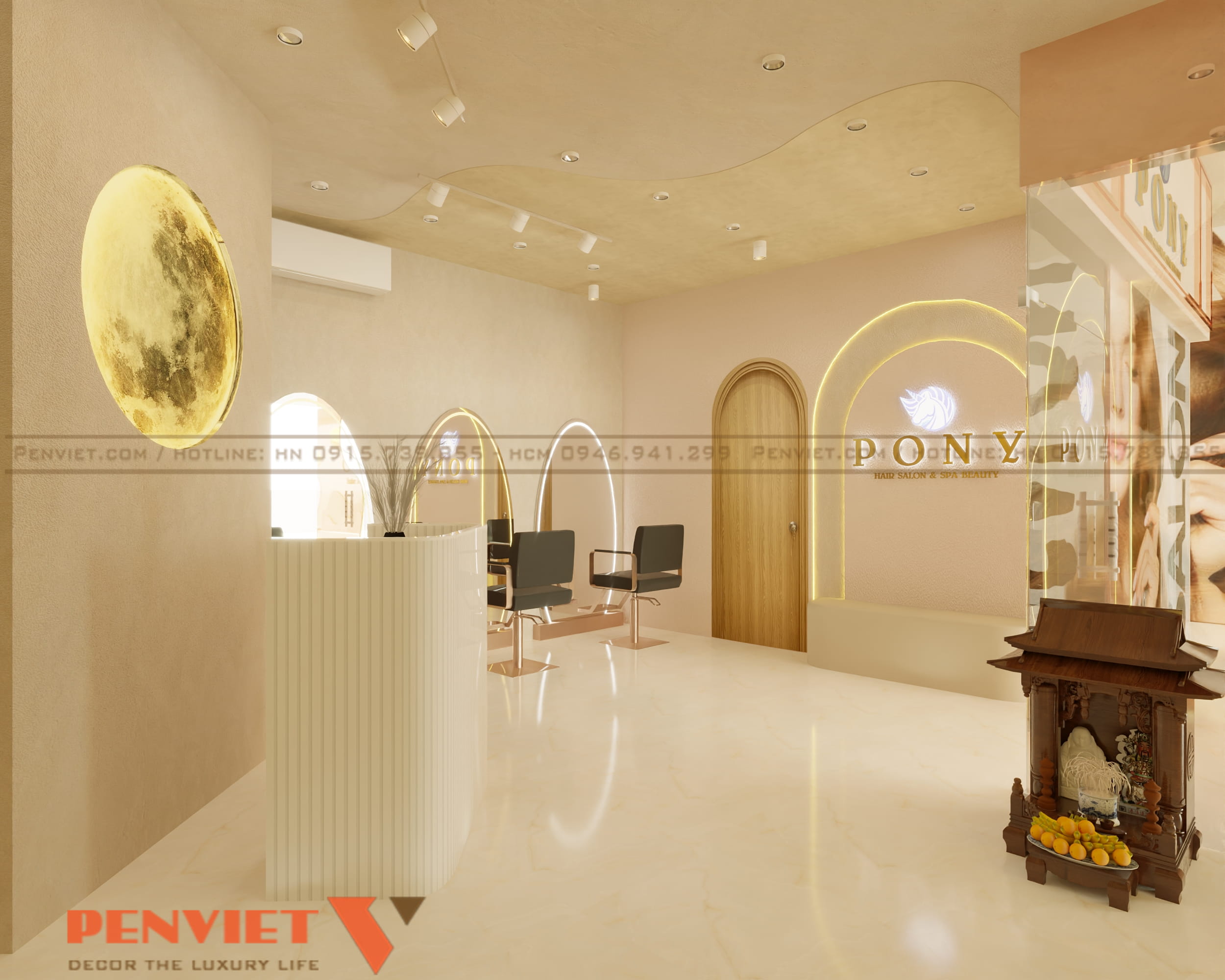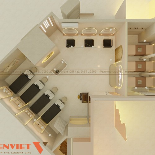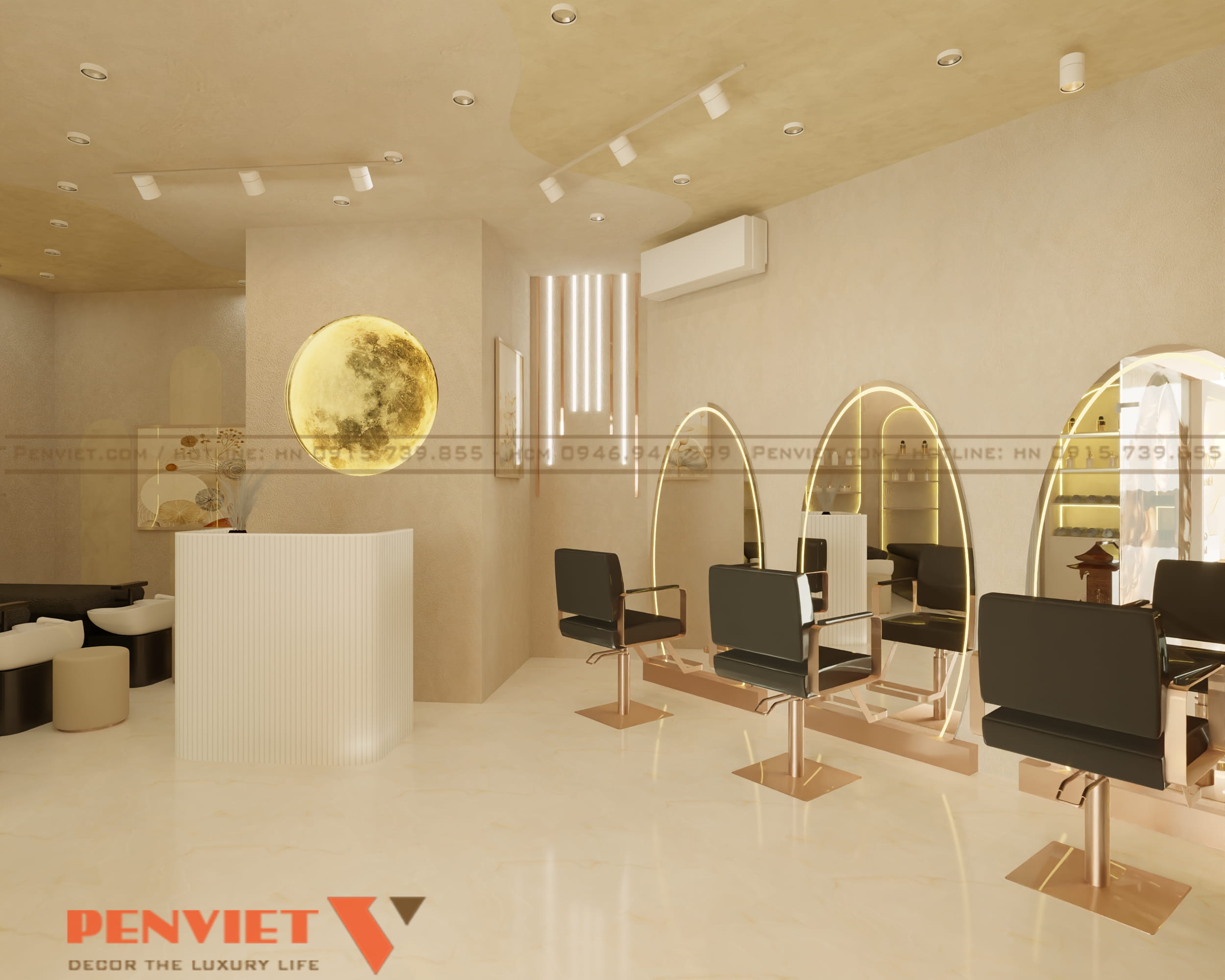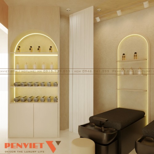 Không gian spa được định hình theo phong cách hiện đại, tối giản nhưng vẫn có điểm nhấn rõ ràng. Gam màu be, kem và ánh vàng được sử dụng xuyên suốt giúp không gian trở nên ấm áp và dễ chịu. Bề mặt tường và trần xử lý mịn, hạn chế chi tiết rườm rà để tạo cảm giác rộng hơn so với diện tích thực.