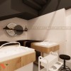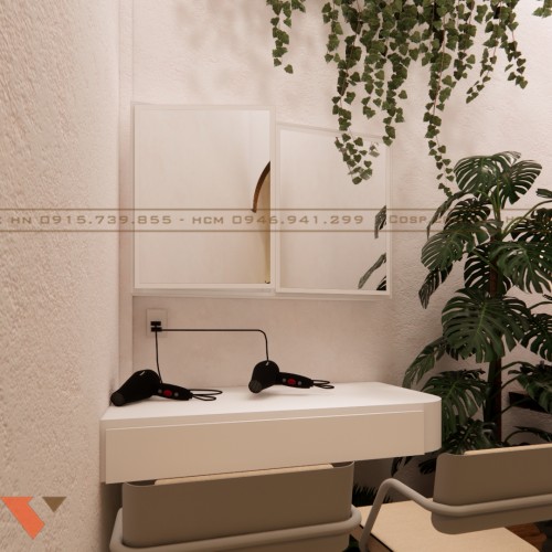 Điểm nổi bật ở đây là bồn gội dạng nằm, tích hợp bệ đỡ cổ và bồn sứ cao cấp, giúp khách hàng có tư thế thoải mái nhất trong suốt liệu trình. Hệ thống tủ trữ đồ, kệ mỹ phẩm và xe đẩy dụng cụ cũng được bố trí gọn gàng, tối ưu hóa quy trình làm việc của kỹ thuật viên.