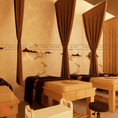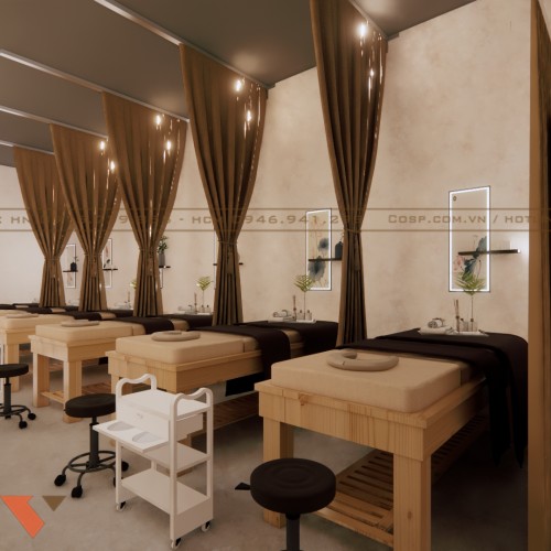 Khu vực trị liệu là trái tim của spa để khách hàng được thư giãn, phục hồi và tái tạo năng lượng. Hosan Spa đầu tư không gian trị liệu theo lối thiết kế đồng bộ, sử dụng giường massage gỗ tự nhiên, rèm ngăn cách từng giường để đảm bảo sự riêng tư nhưng không làm mất đi tính liên kết không gian.