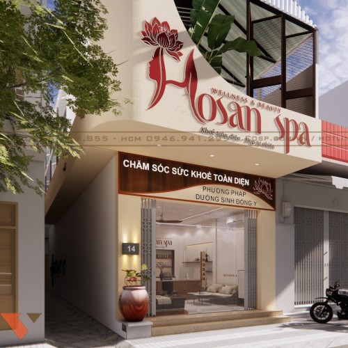 Ngay từ mặt tiền, biển hiệu Hosan Spa đã gây ấn tượng mạnh với người đi đường. Thiết kế bảng hiệu lớn chiếm trọn phần mặt đứng tầng một và một phần tầng lửng, sử dụng tông màu kem đỏ nâu đặc trưng kết hợp họa tiết hoa sen cách điệu mang ý nghĩa thanh lọc, thư giãn và hướng về sự an yên trong tâm trí.