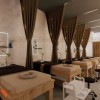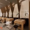 Phía cuối mặt bằng là khu gội đầu dưỡng sinh, được ngăn cách nhẹ bằng mảng tường cong bo tròn và hệ thống rèm. Sử dụng bồn gội nằm chuyên dụng, ánh sáng dịu, bố trí kệ sản phẩm và đồ nghề hợp lý giúp khách thả lỏng hoàn toàn sau liệu trình.