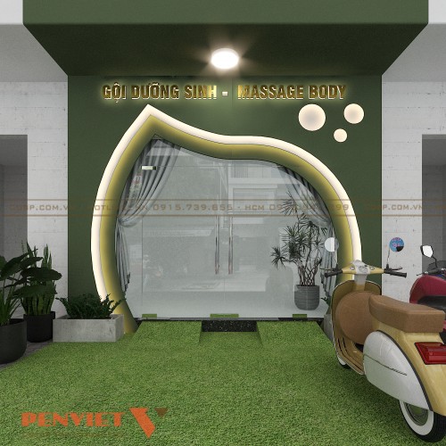 Khu vực mặt tiền spa được thiết kế với gam màu xanh lá dịu nhẹ, thu hút ánh nhìn. Các thông tin về spa được cung cấp chi tiết giúp khách hàng dễ nhận diện thương hiệu.