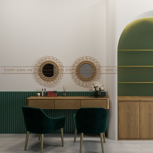 Chất liệu gỗ được sử dụng trang trí vách giường và nội thất xung quanh nổi bật. Bên cạnh đó là hệ thống tủ trưng bày sản phẩm bằng gỗ MDF bền bỉ có đèn LED hắt sáng bên trong. Vừa có công dụng trang trí vừa giới thiệu mỹ phẩm spa đến với khách hàng hiệu quả.
