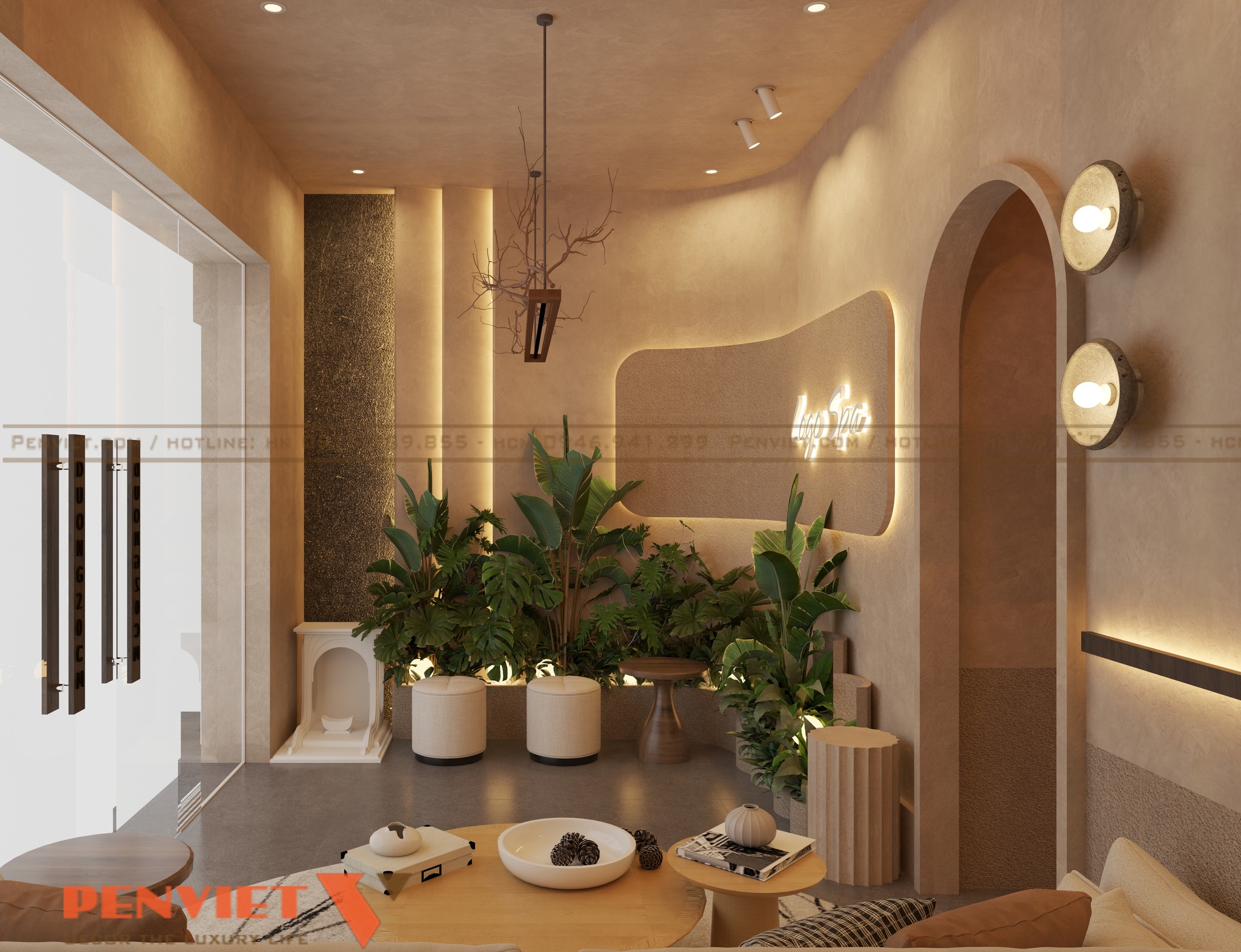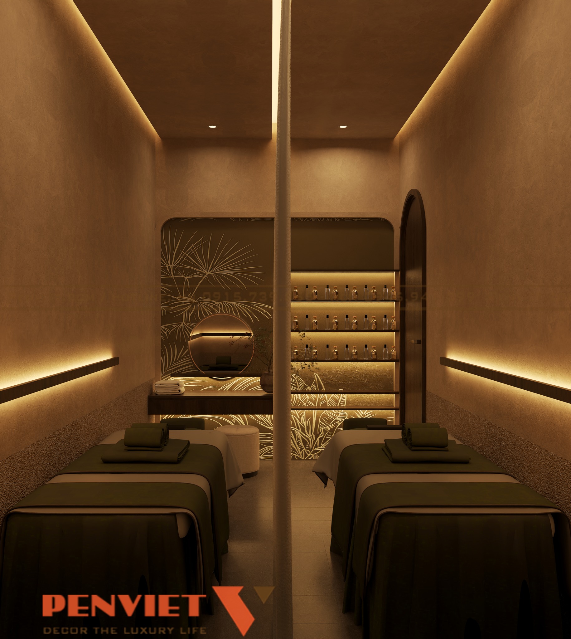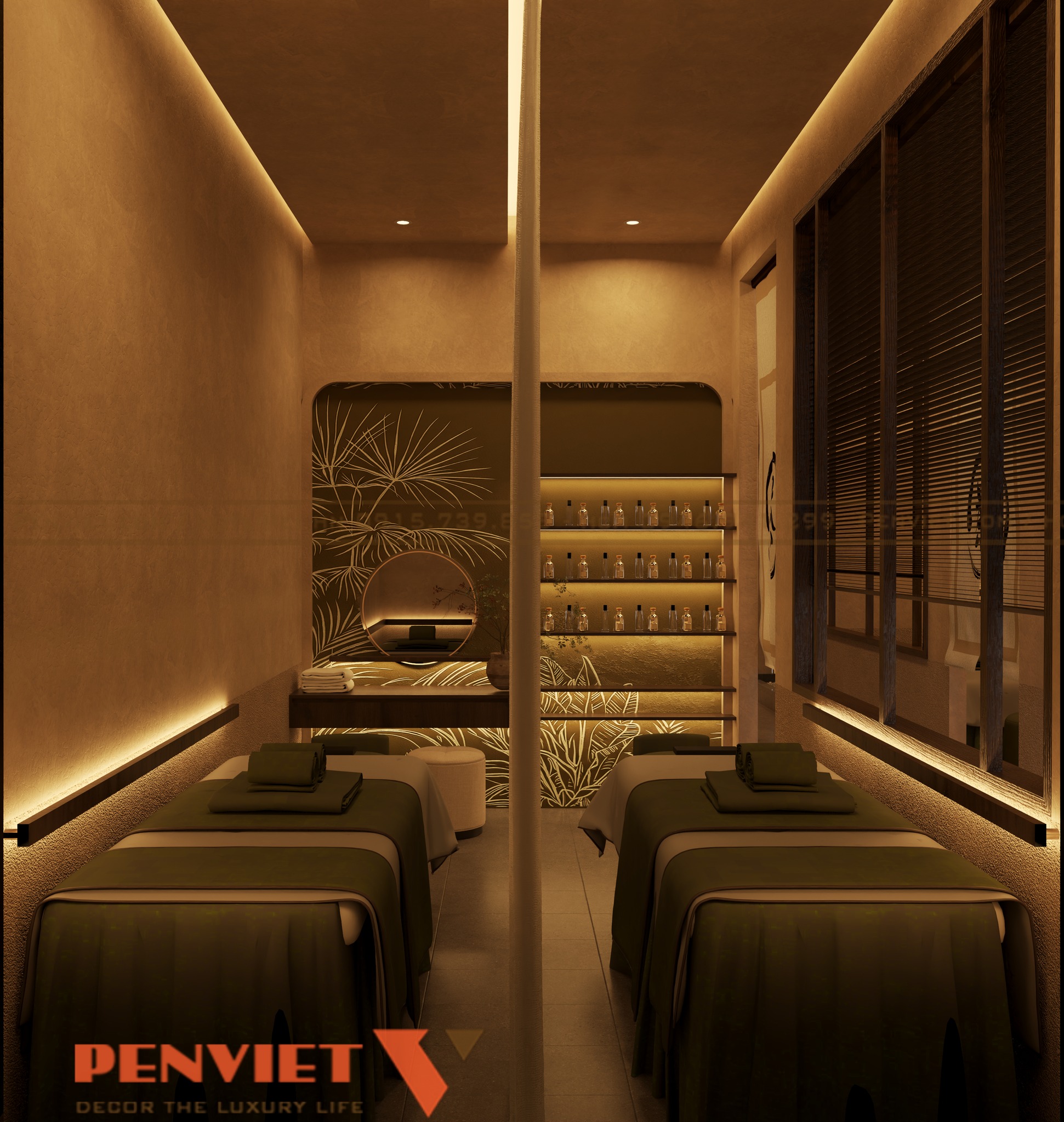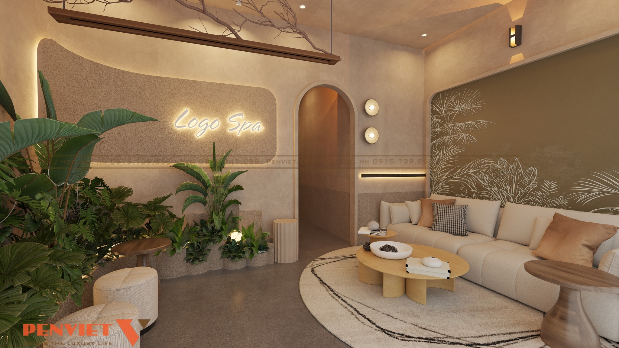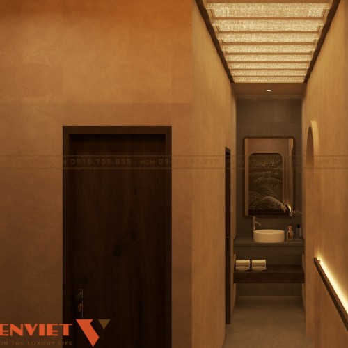 Với diện tích 127,5m2, dự án được xây dựng theo phong cách spa trị liệu thiên về sự tĩnh lặng và cân bằng. Tông màu chủ đạo là màu be, nâu gỗ và ánh sáng vàng dịu. Sự kết hợp này mang lại cảm giác ấm áp và gần gũi.