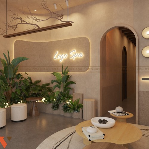 Khu vực lễ tân được bố trí ngay tại mặt tiền, giúp khách dễ dàng nhận diện thương hiệu spa. Mảng tường logo được thiết kế âm tường kết hợp ánh sáng hắt nhẹ. Điều này tạo điểm nhấn thị giác ngay khi khách bước vào.