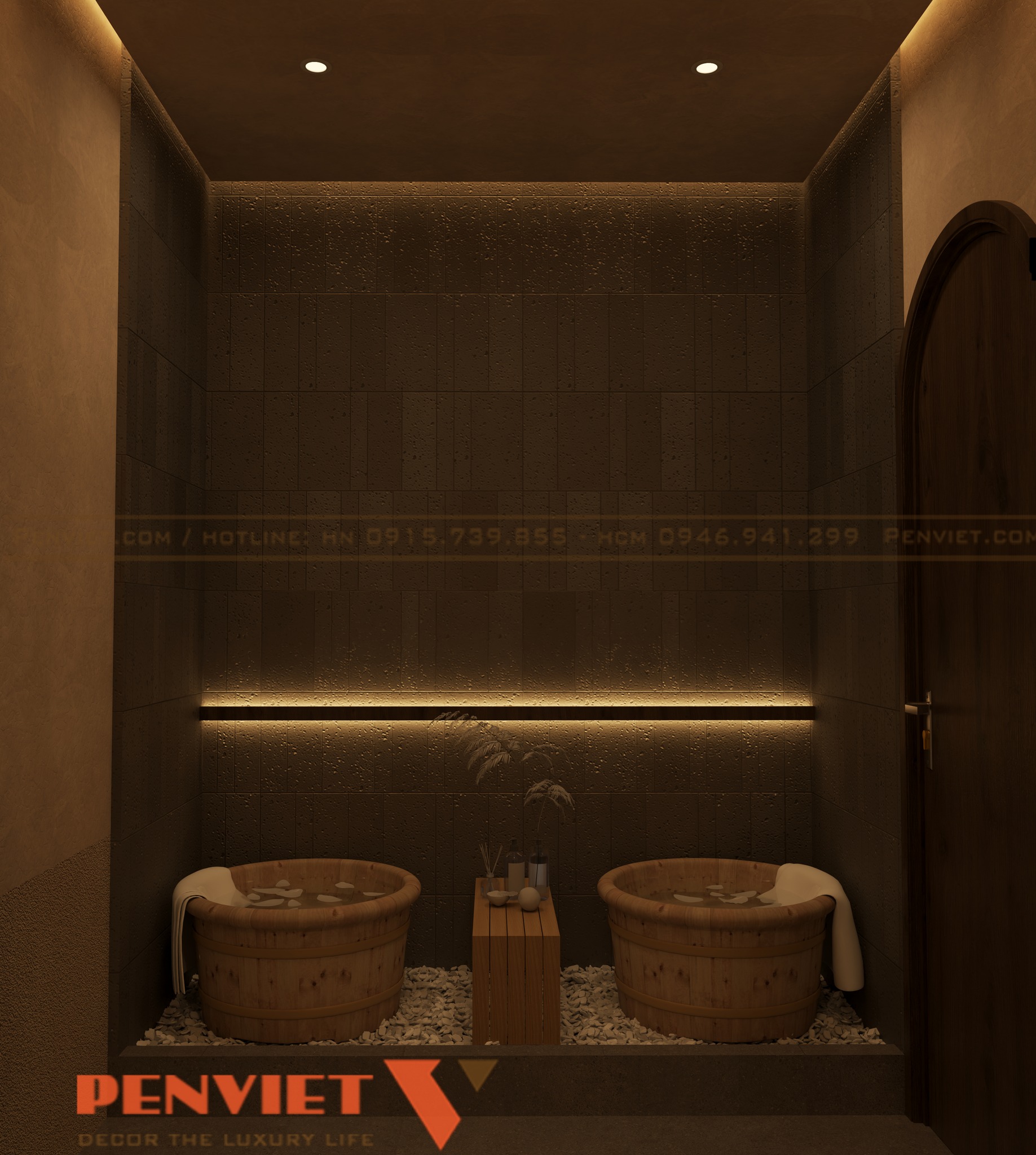 Khu ngâm thảo dược là điểm nhấn của dự án. Các bồn gỗ tròn được đặt đối xứng, tạo cảm giác cân bằng trong thiết kế. Chất liệu gỗ tự nhiên giúp tăng trải nghiệm trị liệu.