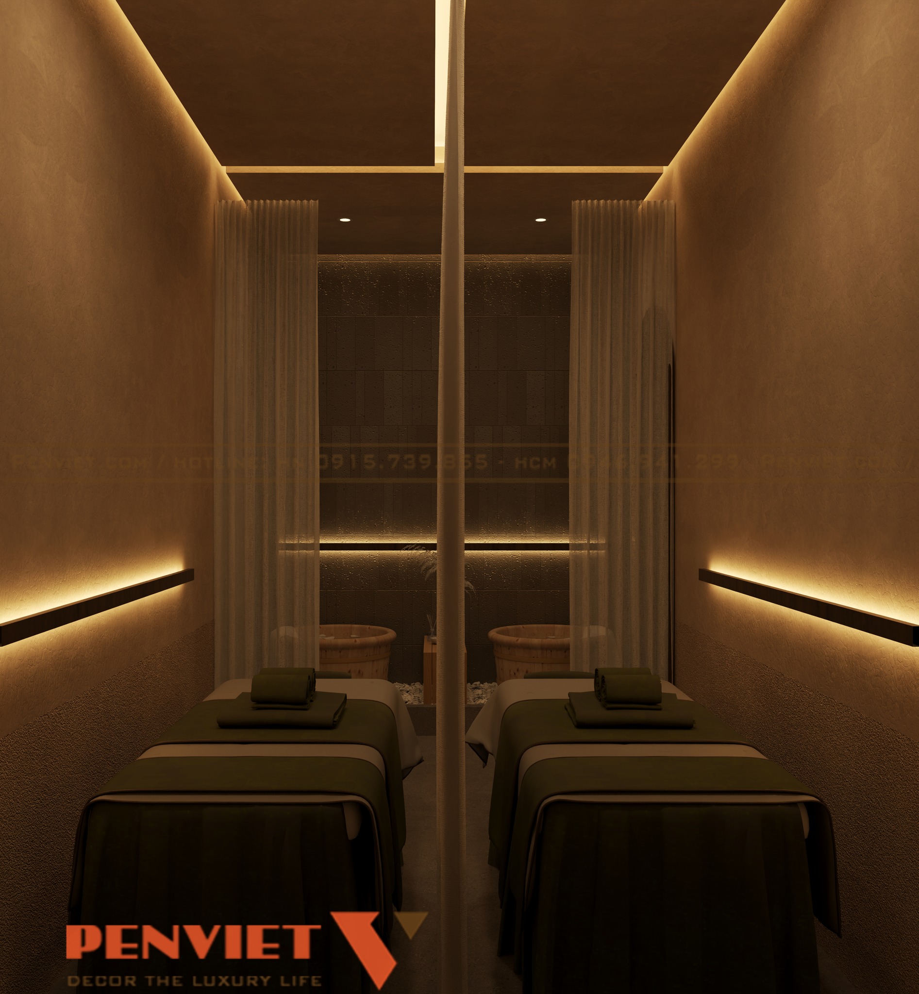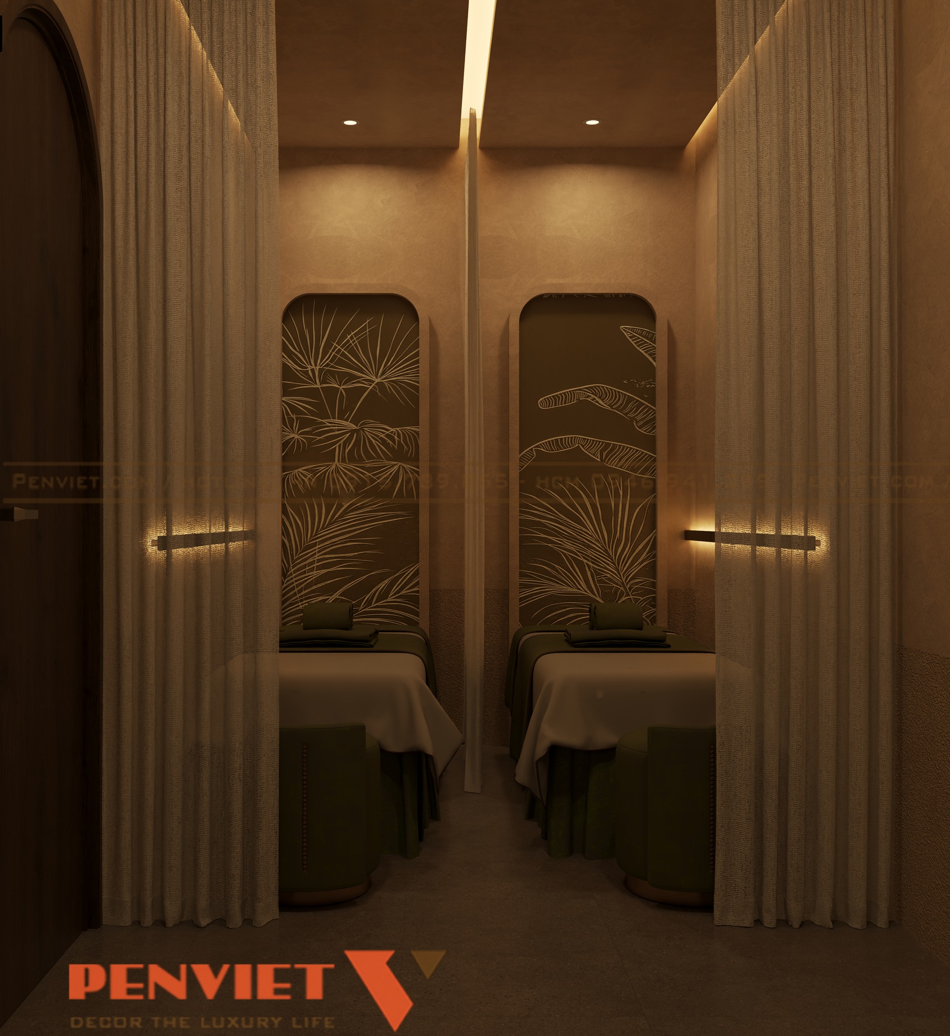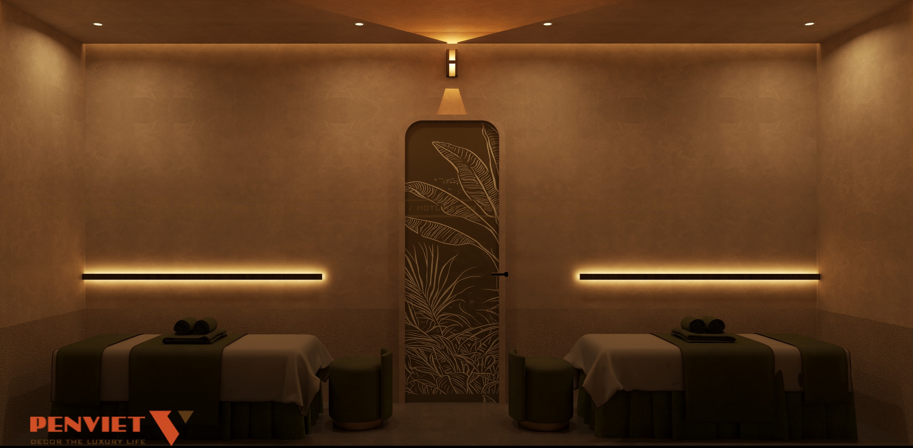Không gian trị liệu được thiết kế với ánh sáng dịu và màu sắc trầm ấm. Điều này giúp khách hàng dễ dàng thư giãn khi sử dụng dịch vụ. Hệ thống chiếu sáng gián tiếp được bố trí khéo léo để tránh gây chói mắt.