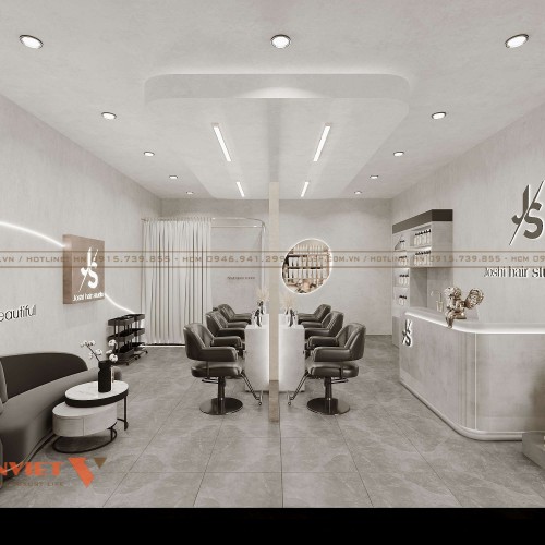 Khu vực tiếp đón khách hàng được thiết kế với quầy lễ tân hiện đại, hình dáng cong mềm mại tạo nên cảm giác dễ chịu và thân thiện. Logo của salon "JS" được gắn nổi trên quầy lễ tân, dễ dàng thu hút sự chú ý của khách hàng. Một tượng thiên thần nhỏ được đặt trên quầy, như một điểm nhấn nghệ thuật tạo cảm giác nhẹ nhàng và thanh thoát.