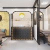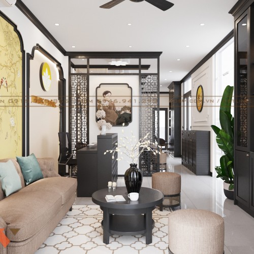 Ngay khi bước qua cửa chính, khách hàng sẽ nhìn thấy cách bố trí tinh tế của khu vực tiếp đón. Vách tường màu vàng nhạt nổi bật với họa tiết chim hạc, hoa lá mang đậm nét Á Đông được bao khung bởi viền đen uốn lượn mềm mại phía sau ghế ngồi là điểm nhấn tạo dấu ấn thị giác khó quên.