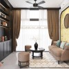 Ánh sáng tự nhiên tràn vào qua hệ thống rèm lụa nâu kết hợp cùng lớp rèm trắng mỏng phía trong. Quạt trần đen kiểu truyền thống tăng thêm phần cổ kính mà vẫn đảm bảo chức năng làm mát dịu nhẹ.