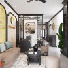 Chiếc ghế sofa màu nâu nhạt thiết kế cổ điển, kết hợp cùng gối xanh pastel mang lại cảm giác dễ chịu, dịu mắt. Bàn trà tròn màu đen được đặt trên thảm có hoa văn hình học tinh tế, gợi sự hòa hợp giữa truyền thống và hiện đại. Một bình hoa gốm đen đặt giữa bàn như điểm nhấn nghệ thuật.
