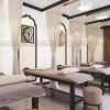 Tường khu trị liệu được nhấn bằng các khung tranh nghệ thuật mang phong cách truyền thống với hình ảnh hoa sen, cô gái cổ trang, biểu tượng văn hóa Á Đông. Trần nhà được trang trí bằng các chùm đèn trần hình cánh sen, ánh sáng trắng dịu nhẹ lan tỏa đều khắp phòng.