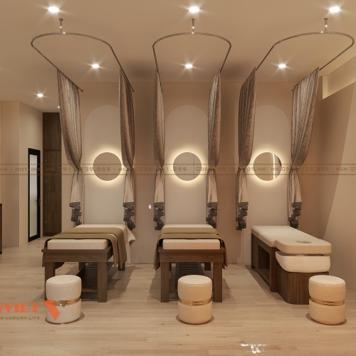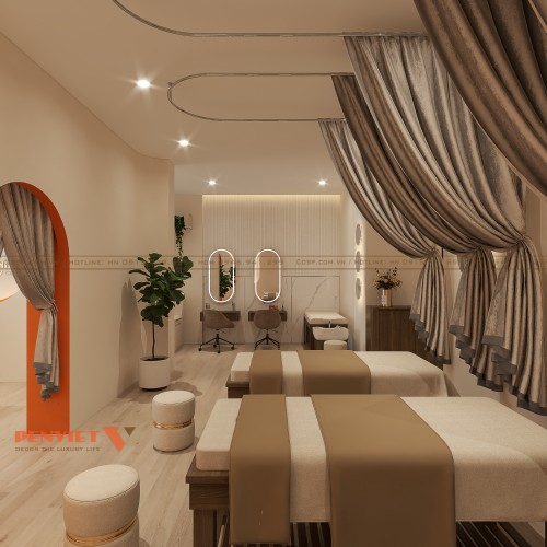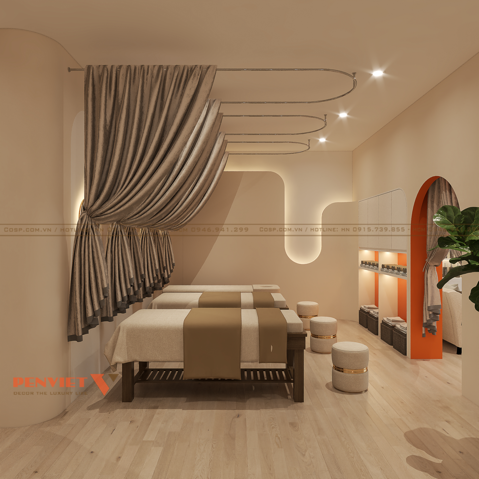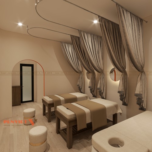 Phòng massage của spa là nơi giúp khách hàng thư giãn và trải nghiệm dịch vụ được thiết kế tinh tế và tối giản. Màu sắc chủ đạo là gam màu nâu ấm áp, mang lại cảm giác nhẹ nhàng và dễ chịu. Giường bọc nệm êm ái, phối cùng màu vải trải giường màu be. Các rèm che xung quanh tạo sự riêng tư để quý khách cảm thấy thoải mái hơn trong suốt quá trình massage.