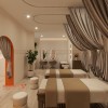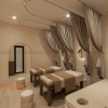 Phòng massage riêng có cách bố trí nội thất tương đồng khu vực ngoài nhưng có sự riêng tư cao dành cho nhóm khách hàng. Rèm che tạo sự riêng tư vừa giúp trang trí cho không gian spa.