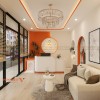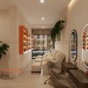 Phòng lễ tân của spa Quỳnh Anh được bài trí tỉ mỉ với gam màu cam và trắng làm chủ đạo. Quầy gam màu trắng có kiểu dáng hiện đại kết hợp với đèn chùm pha lê trang trí trên trần nhà làm nổi bật không gian. Phía sau quầy là logo gắn tường, có đèn LED làm nổi bật tên spa "Quỳnh Anh beauty cosmetic" tạo ấn tượng chuyên nghiệp và đẳng cấp.
