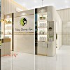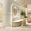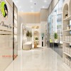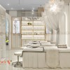 Một khu vực quan trọng khác không thể bỏ qua tại Spa Thùy Dương chính là kệ trưng bày sản phẩm. Các mẫu kệ tủ kích thước lớn, tông màu trắng chủ đạo, viền vàng nổi bật thanh lịch và sang trọng. Các sản phẩm chăm sóc da, tóc được sắp xếp ngay ngắn để khách hàng dễ dàng lựa chọn sản phẩm quan tâm. Đèn chiếu sáng bên trong kệ giúp làm nổi bật sản phẩm và thể hiện sự hiện đại cho không gian.
