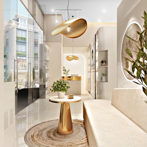 Khi bước vào Spa Thùy Dương, khách hàng ngay lập tức cảm nhận được sự đón tiếp nồng hậu và tinh tế tại khu vực lễ tân. Không gian lễ tân được thiết kế với phong cách hiện đại nhưng vẫn mang đậm chất thư giãn và nhẹ nhàng. Tông màu chủ đạo là trắng kem, kết hợp với các chi tiết nẹp viền inox vàng gold tạo nên vẻ sang trọng mà không hề lạnh lùng.
