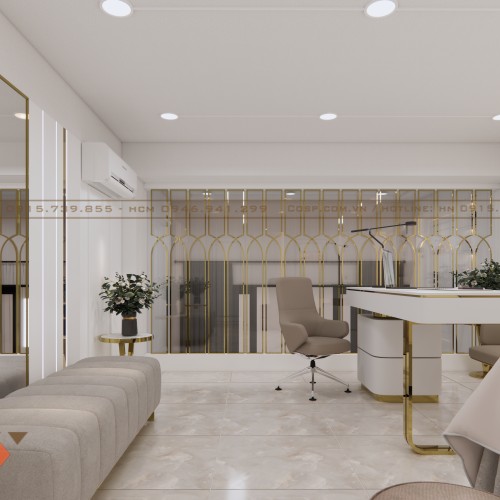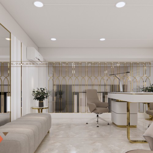 Một trong những điểm nhấn đặc biệt của phòng tư vấn là việc sử dụng nẹp inox sáng bóng. Chi tiết trang trí này tạo vẻ đẹp tinh tế và tăng thêm sự sang trọng cho không gian. Chúng phản chiếu ánh sáng, tạo hiệu ứng lấp lánh mà không quá phô trương, thể hiện đẳng cấp của LEBOSS spa. Các chi tiết cắt CNC làm vách ngăn rất ấn tượng.