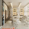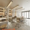 Dọc theo các bức tường là hệ tủ âm trưng bày sản phẩm vừa đóng vai trò lưu trữ, vừa là điểm nhấn trang trí quan trọng. Các kệ được chia ô rõ ràng, sắp xếp các dòng mỹ phẩm, dụng cụ thẩm mỹ và tài liệu học tập một cách khoa học.