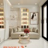 Khu vực tiếp khách với không gian nhỏ gọn nhưng đầy đủ tiện nghi và tinh tế. Bộ sofa màu kem được bọc nệm da cao cấp mang đến cảm giác êm ái, sang trọng. Bàn trà tròn với thiết kế chân kim loại mạ vàng cùng mặt kính trong suốt tăng thêm điểm nhấn hiện đại cho không gian.