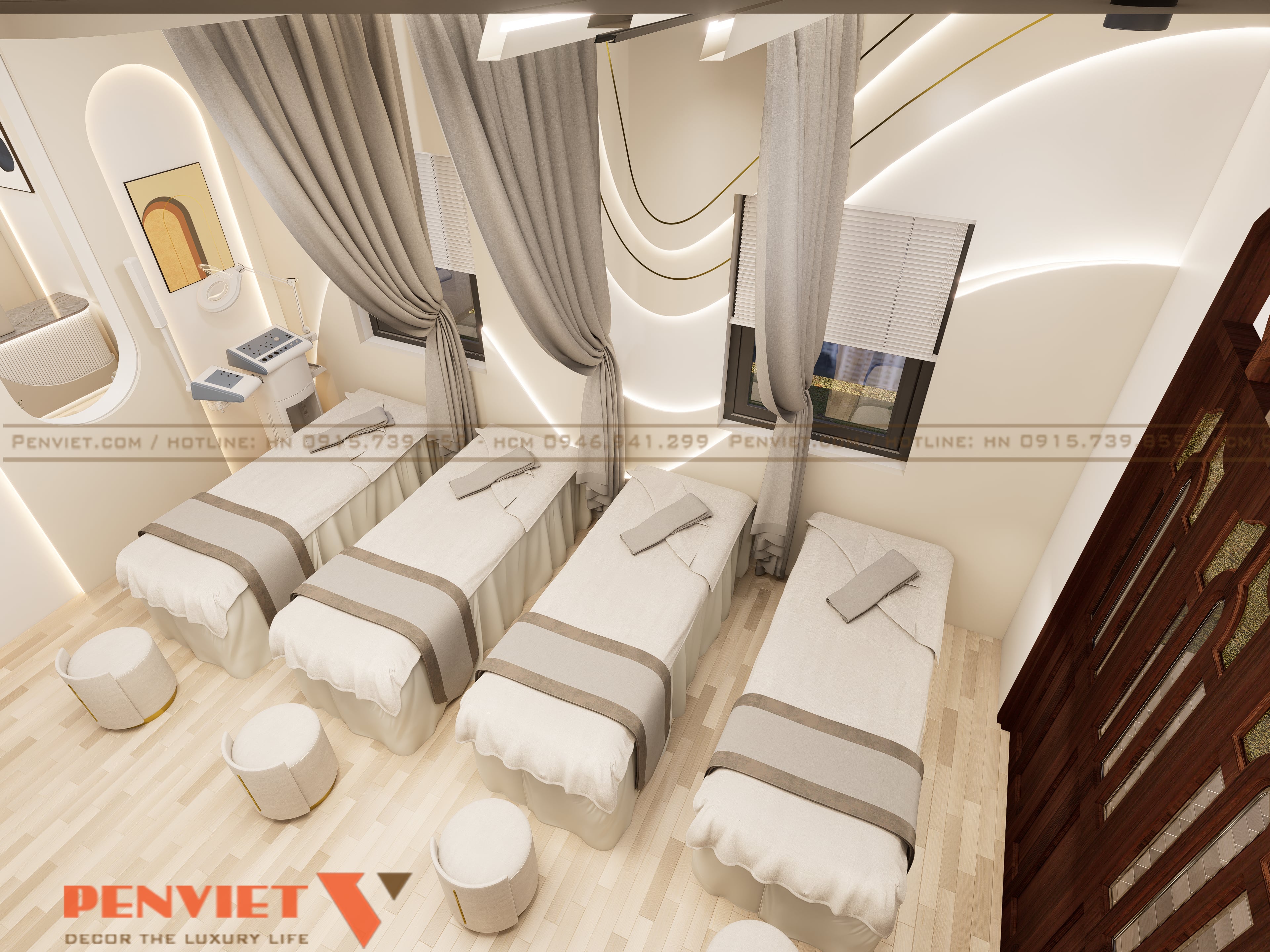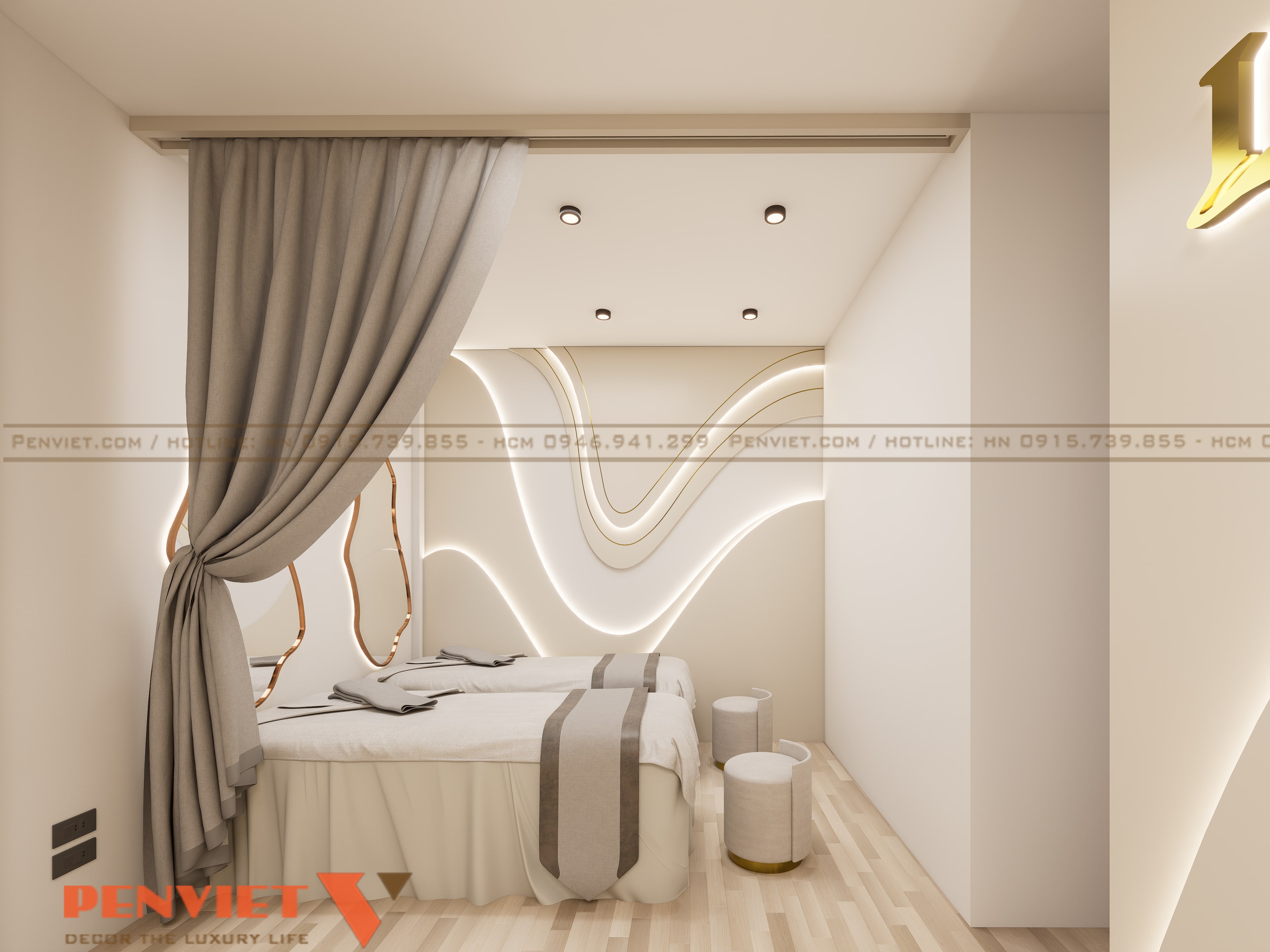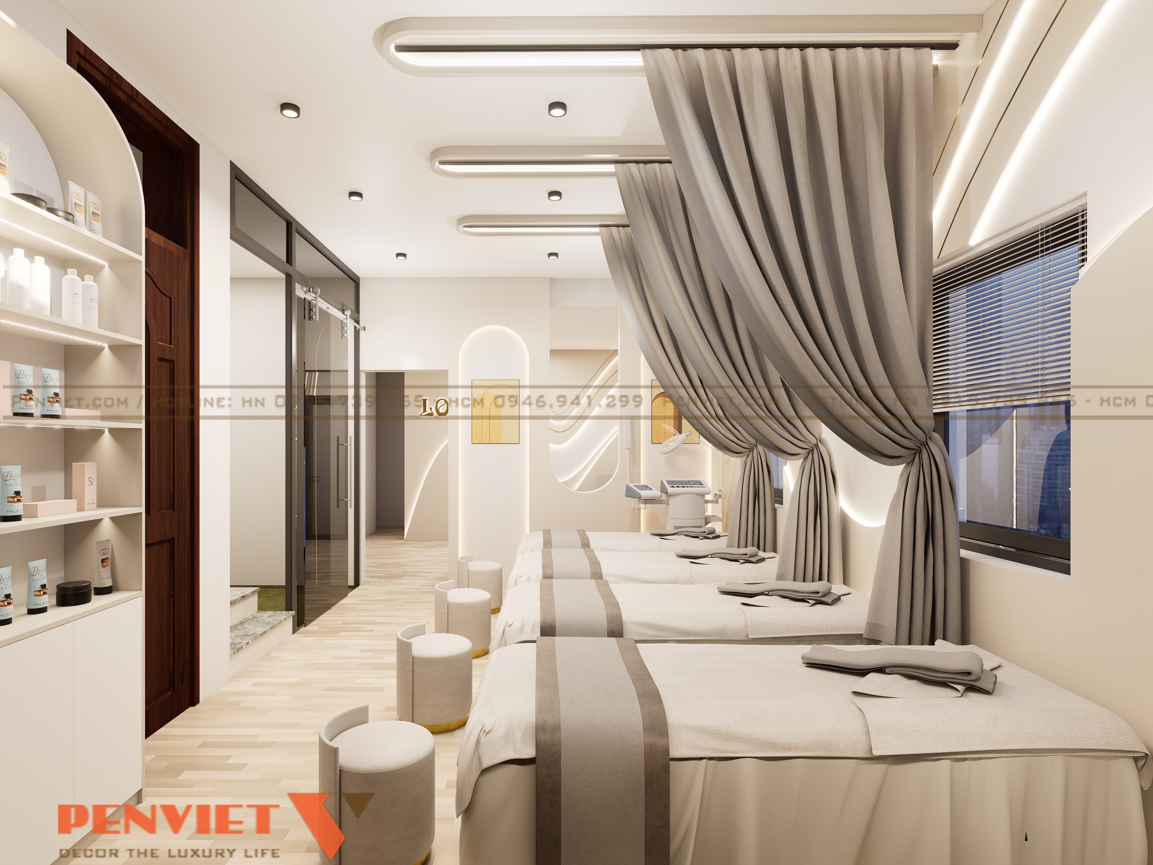 Phòng trị liệu được thiết kế theo hướng tối giản, giảm thiểu tiếng ồn và kích thích thị giác. Hệ rèm mềm kết hợp ánh sáng dịu giúp khách hàng dễ dàng thả lỏng tinh thần. Giường spa được bố trí khoa học, đảm bảo khoảng cách cần thiết cho thao tác của kỹ thuật viên. Đây là yếu tố then chốt giúp nâng cao chất lượng dịch vụ.