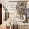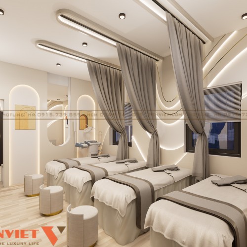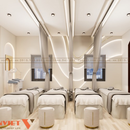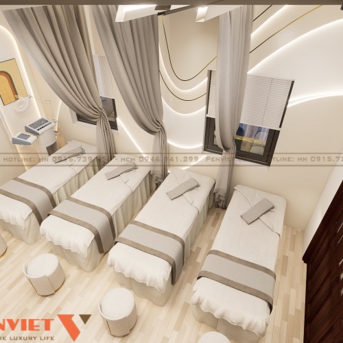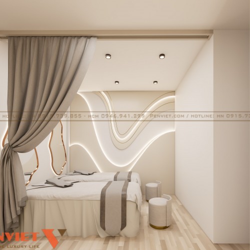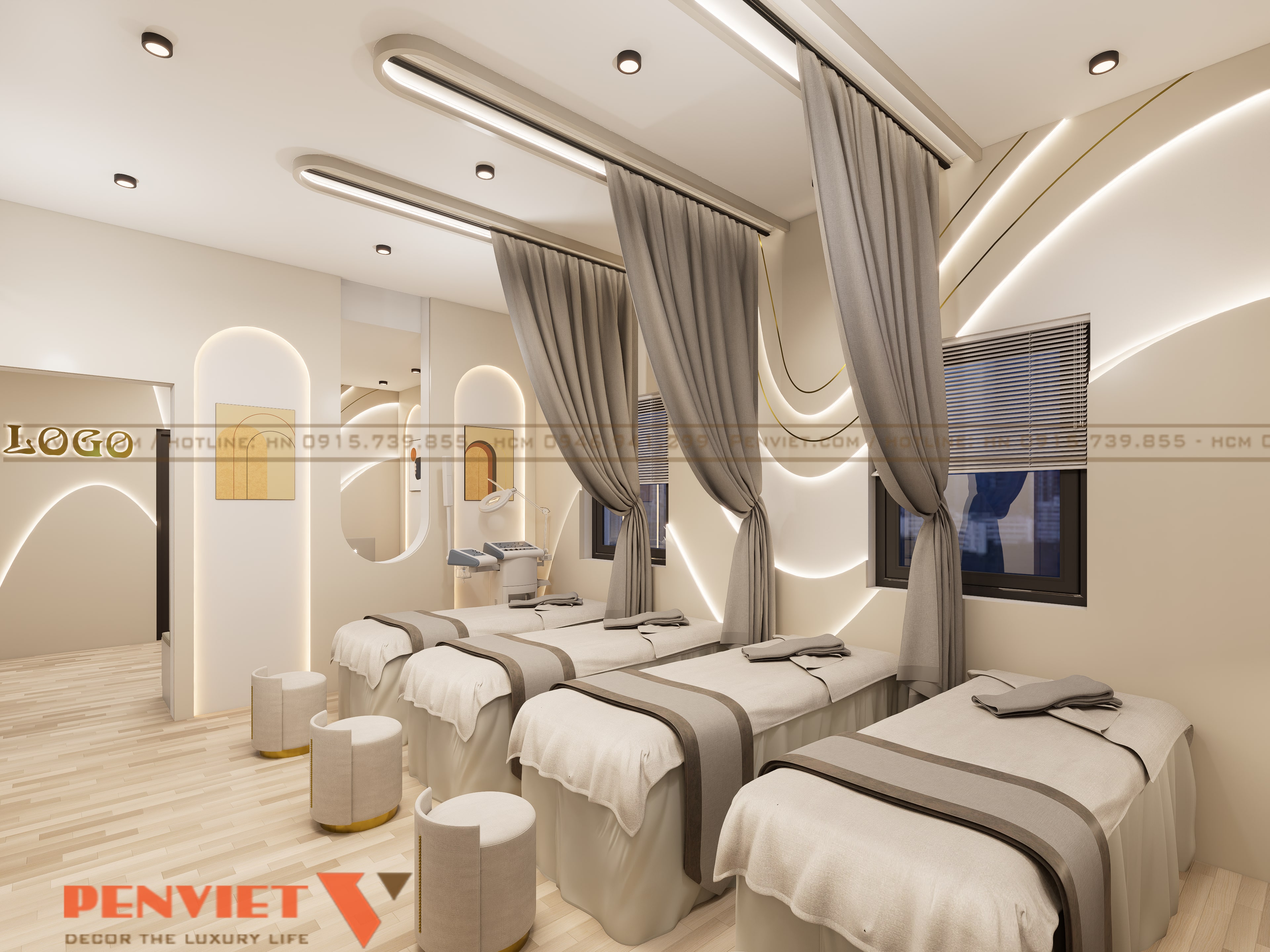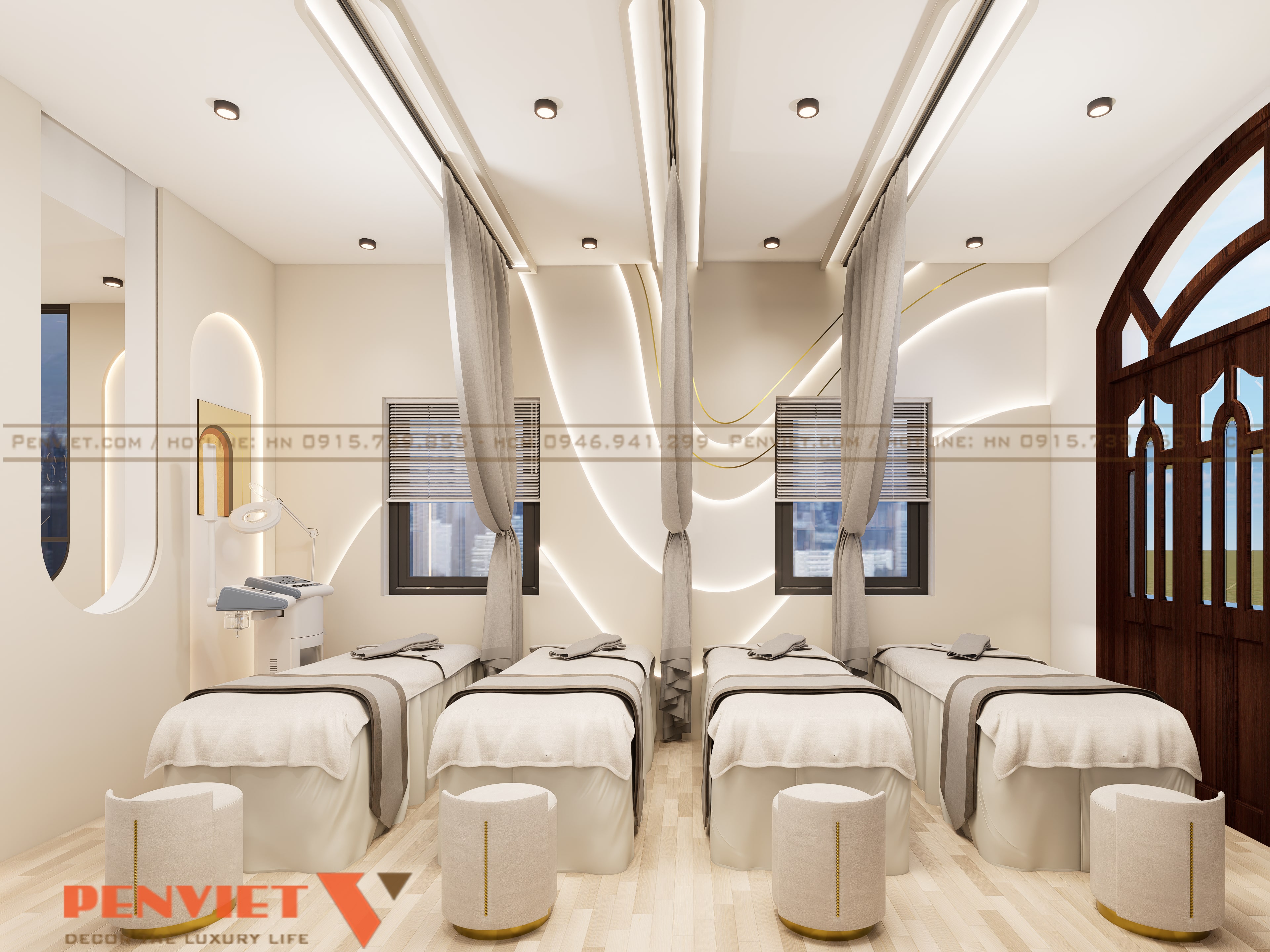 Phòng trị liệu được thiết kế theo hướng tối giản, giảm thiểu tiếng ồn và kích thích thị giác. Hệ rèm mềm kết hợp ánh sáng dịu giúp khách hàng dễ dàng thả lỏng tinh thần. Giường spa được bố trí khoa học, đảm bảo khoảng cách cần thiết cho thao tác của kỹ thuật viên. Đây là yếu tố then chốt giúp nâng cao chất lượng dịch vụ.