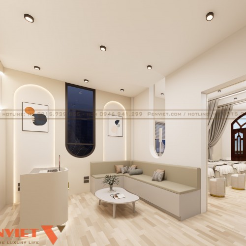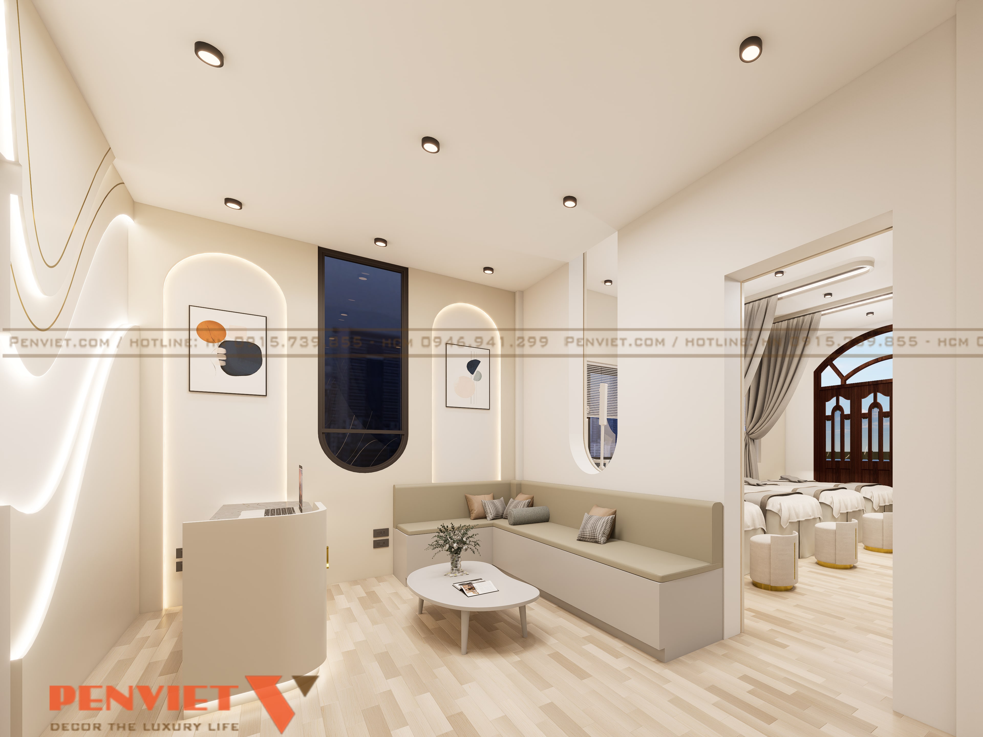 Không gian chờ được bố trí sofa dài áp tường, kết hợp bàn trà nhỏ, tạo sự thoải mái trong thời gian chờ dịch vụ. Cách sắp xếp này giúp tận dụng diện tích hiệu quả mà vẫn giữ được sự thông thoáng. Đối với các spa cải tạo từ nhà ở, giải pháp này đặc biệt phù hợp. Không gian chờ trở thành điểm cộng lớn trong trải nghiệm tổng thể của khách hàng.
