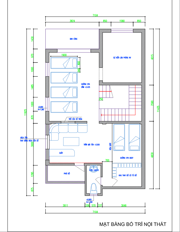 Mặt bằng spa được phân chia rõ ràng giữa khu lễ tân, khu chờ và khu phòng trị liệu. Lối di chuyển được tổ chức mạch lạc, tránh giao thoa giữa khách và nhân viên trong quá trình vận hành. Điều này giúp không gian luôn gọn gàng và chuyên nghiệp trong mắt khách hàng. Đối với chủ đầu tư, đây là yếu tố quan trọng khi cải tạo spa đang hoạt động hoặc nâng cấp mô hình kinh doanh.