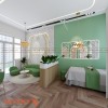 Xanh lá pastel tạo cảm giác yên bình, nhẹ nhàng để khách hàng có thể thư giãn ngay khi bước vào. Tông gỗ ấm áp cân bằng với màu xanh, mang lại không gian vừa hiện đại vừa thân thiện. Bên cạnh đó, các chi tiết ánh sáng vàng ấm từ đèn treo và viền LED tinh tế góp phần làm nổi bật không gian, đồng thời tạo cảm giác sang trọng và thoải mái.