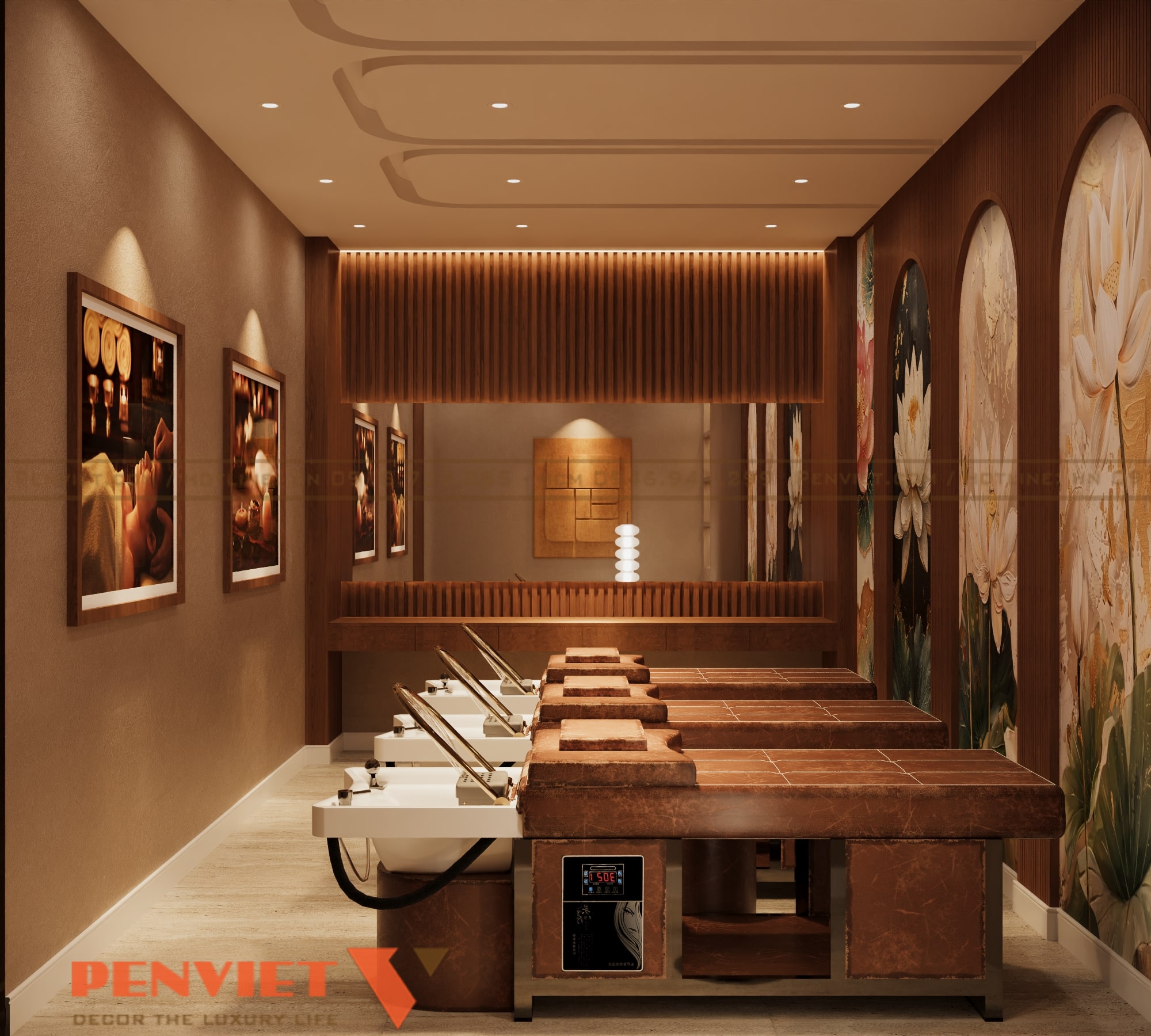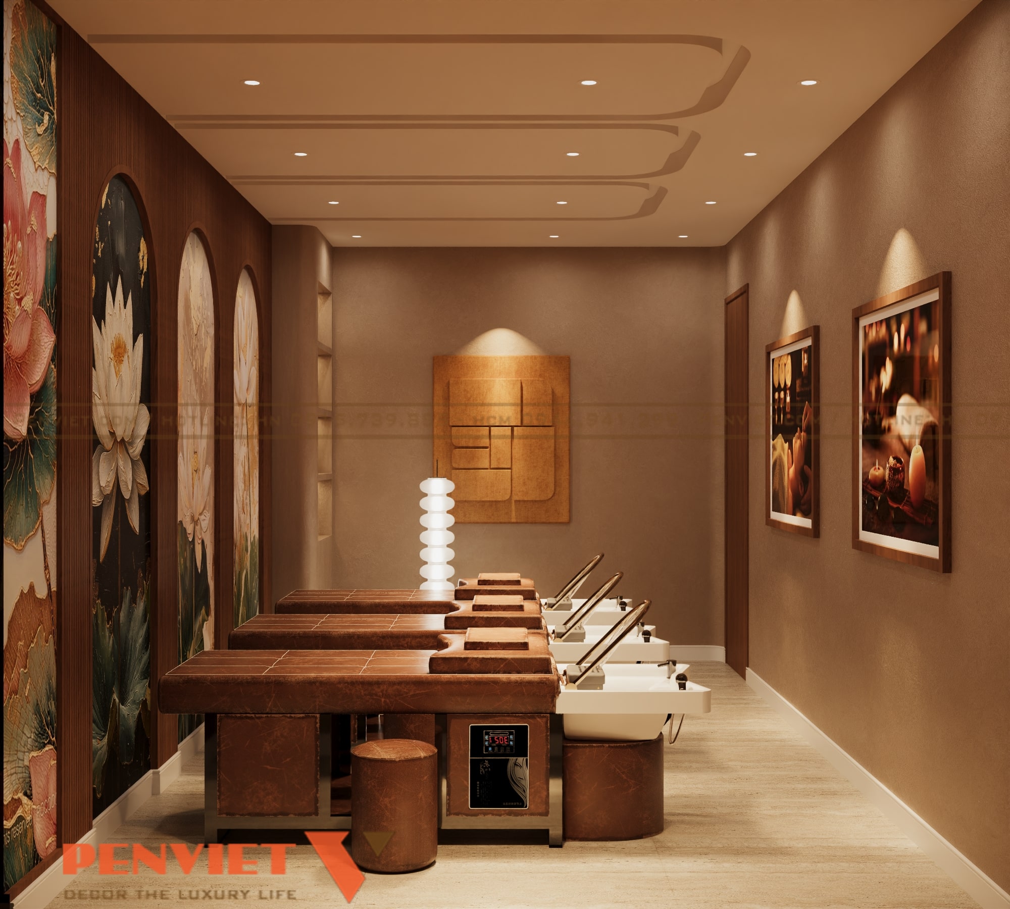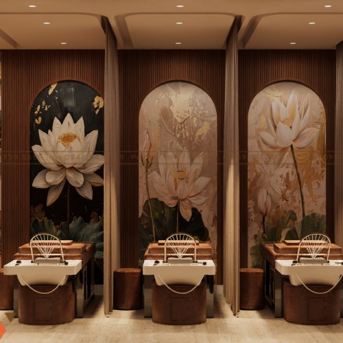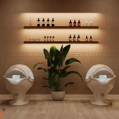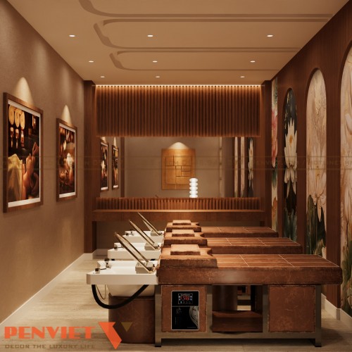 Không gian spa được thiết kế theo định hướng trị liệu, lấy cảm giác tĩnh tại và cân bằng làm trọng tâm. Gam màu nâu ấm, be trầm và ánh sáng vàng dịu giúp không gian trở nên sâu lắng, dễ đưa khách hàng vào trạng thái thư giãn. Các đường nét thiết kế mềm mại, hạn chế góc cạnh, tạo cảm giác an toàn và dễ chịu. Đây là phong cách phù hợp cho các chủ đầu tư muốn nâng cấp spa theo hướng chuyên nghiệp và bền vững.