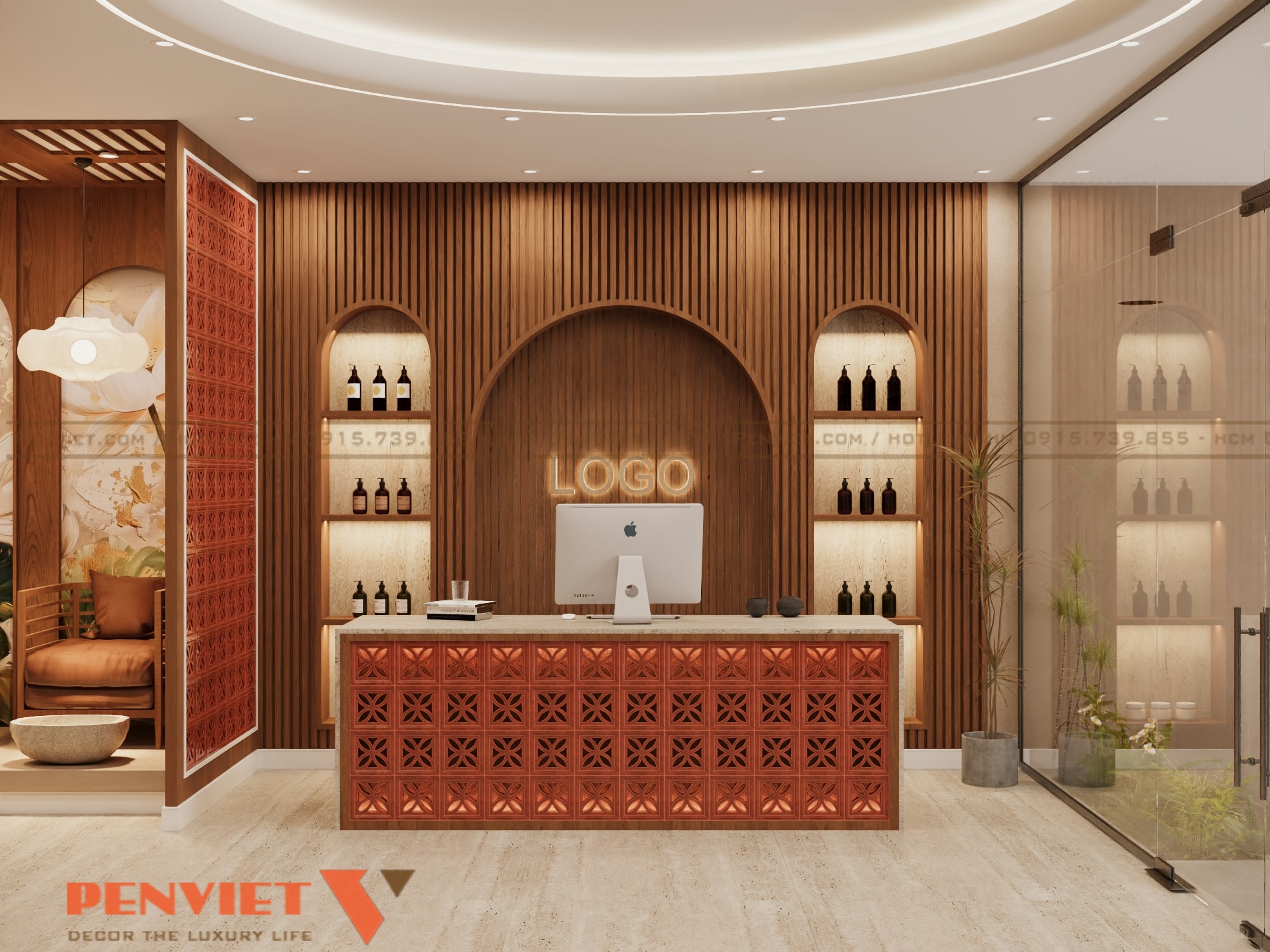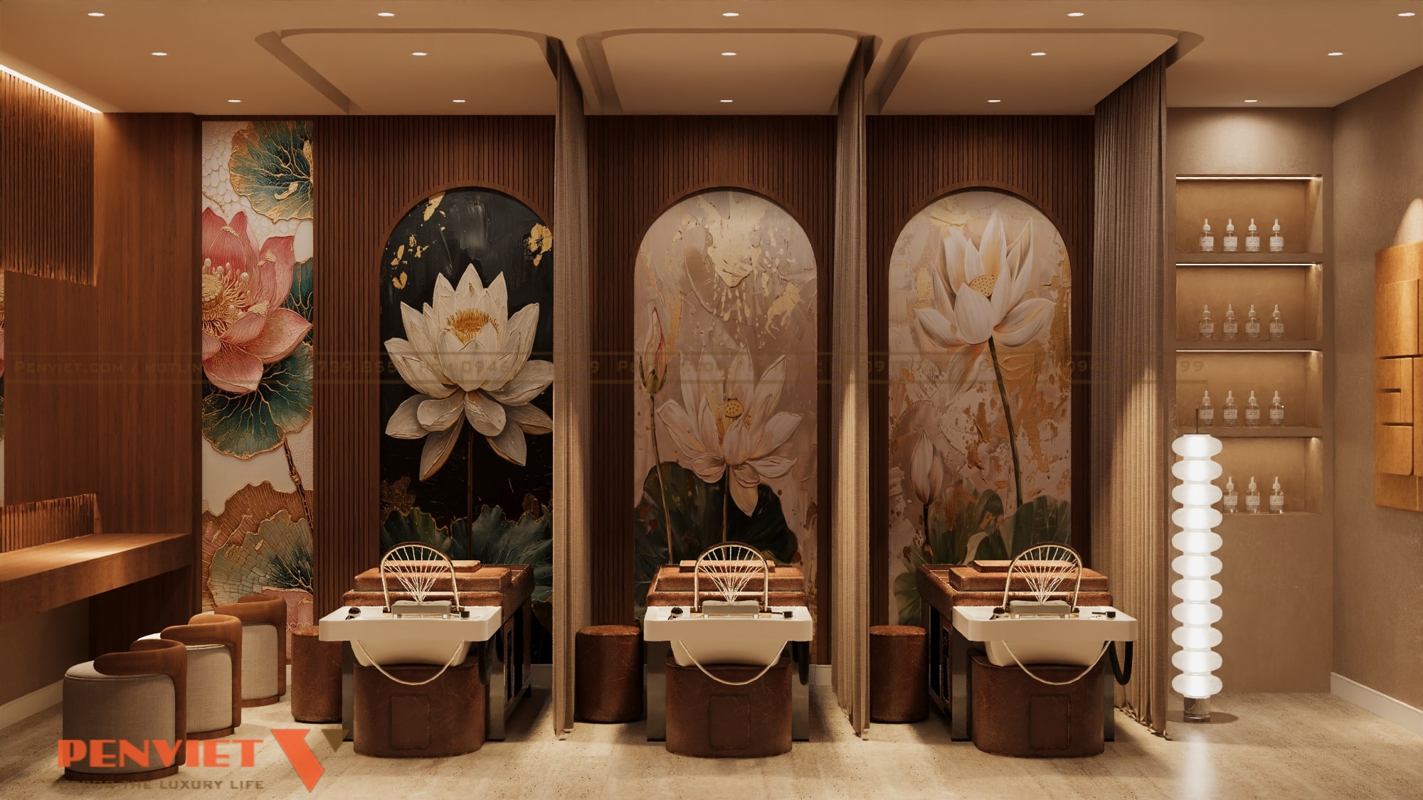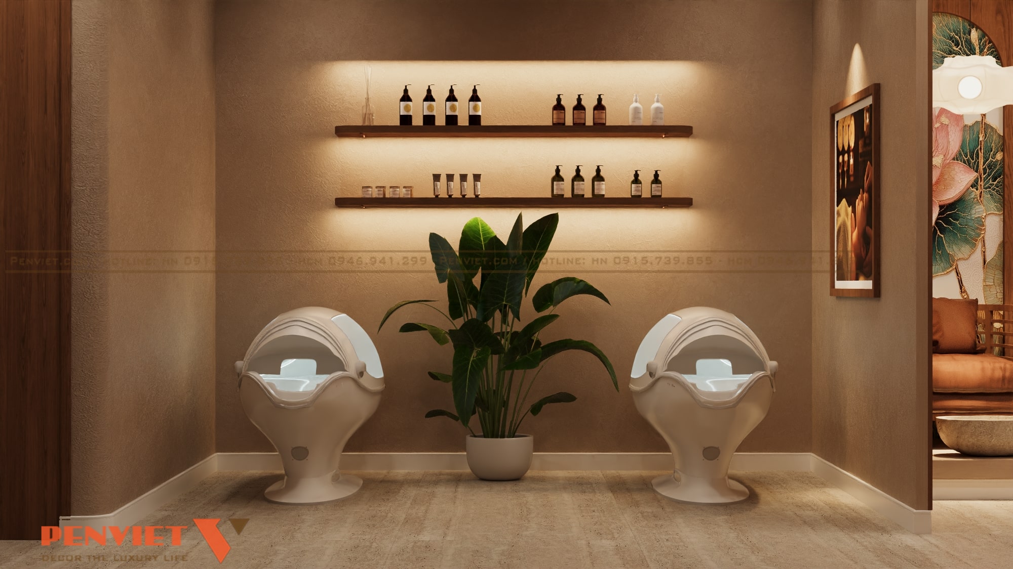 Không gian spa được thiết kế theo định hướng trị liệu, lấy cảm giác tĩnh tại và cân bằng làm trọng tâm. Gam màu nâu ấm, be trầm và ánh sáng vàng dịu giúp không gian trở nên sâu lắng, dễ đưa khách hàng vào trạng thái thư giãn. Các đường nét thiết kế mềm mại, hạn chế góc cạnh, tạo cảm giác an toàn và dễ chịu. Đây là phong cách phù hợp cho các chủ đầu tư muốn nâng cấp spa theo hướng chuyên nghiệp và bền vững.