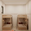 Hệ thống ghế và bồn chăm sóc chân được tích hợp ngay cuối giường trị liệu, giúp tối ưu công năng trong cùng một không gian. Cách bố trí này giảm thiểu việc di chuyển khách giữa các khu vực. Đồng thời, nó giúp rút ngắn thời gian phục vụ mà vẫn giữ được sự riêng tư cần thiết. Đây là điểm mạnh đáng chú ý của phương án thiết kế.
