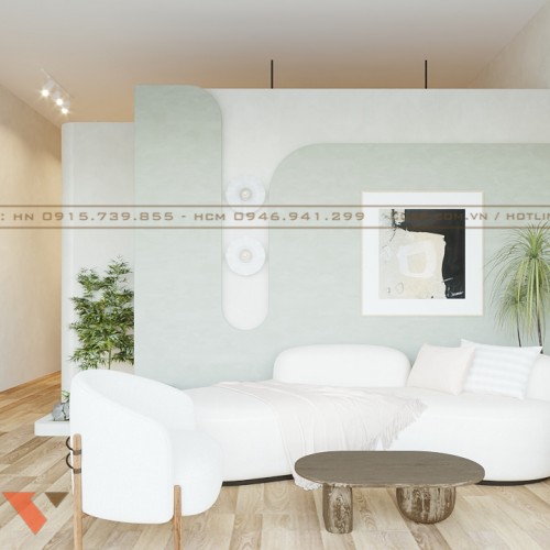 Một điểm nhấn quan trọng trong khu vực tiếp đón chính là việc sử dụng cây xanh, tranh ảnh trang trí để tạo cảm giác tươi mới và thư thái. Cây xanh được đặt phía sau khu vực ghế ngồi không chỉ có tác dụng trang trí mà còn giúp cải thiện chất lượng không khí, mang đến sự thoáng đãng và dễ chịu. Ánh sáng từ hệ thống đèn LED gián tiếp tạo hiệu ứng ánh sáng nhẹ nhàng, không quá chói mắt nhưng vẫn đảm bảo độ sáng cần thiết.