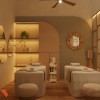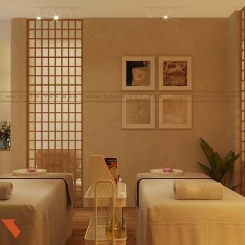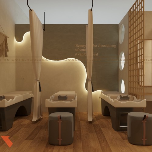 Hệ thống đèn LED gián tiếp đóng vai trò quan trọng giúp phân tán ánh sáng nhẹ nhàng, không gây chói mắt, tạo chiều sâu cho không gian. Bố cục gọn gàng, hài hòa giúp tối ưu hóa công năng sử dụng. Việc sắp xếp nội thất hợp lý tạo cho không gian spa cảm giác rộng rãi hơn và đảm bảo sự thuận tiện trong di chuyển.