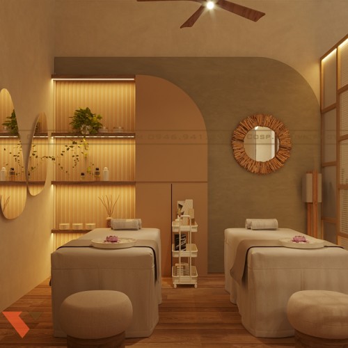 Phòng dịch vụ massage được thiết kế với các khu vực giường gội, giường massage, khu vực làm nail riêng biệt như liên kết nhau. Gương trang trí hình oval kết hợp kệ tủ gỗ với các loại cây xanh nhỏ giúp tăng thêm sự sống động cho không gian.