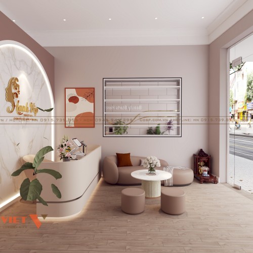 Thiết kế spa Hạnh VIP không thể thiếu khu vực lễ tân đón tiếp khách hàng. Quầy lễ tân được thiết kế với chất liệu gỗ MDF cốt xanh nổi bật, không chỉ giúp chống ẩm tốt mà còn mang lại vẻ đẹp hiện đại. Quầy có thiết kế đơn giản với các đường nét mềm mại. Màu sắc chủ đạo là màu trắng kem sang trọng và chuyên nghiệp.