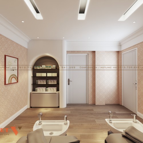 Nơi đây còn bố trí tủ trưng bày các sản phẩm mà spa cung cấp bằng gỗ MDF có nhiều ngăn. Việc sắp xếp mỹ phẩm, dầu gội ngăn nắp tăng thêm sự chuyên nghiệp cho spa có quy mô lớn.