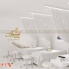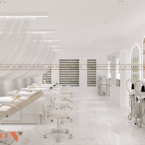 Khu vực giường spa được chia thành từng khu vực riêng biệt, ngăn cách bởi những rèm trắng mềm mại, mang lại cảm giác riêng tư và thoải mái cho từng khách hàng. Ánh sáng trong phòng được điều chỉnh ở mức dịu nhẹ, kết hợp giữa ánh sáng vàng ấm và ánh sáng trắng, giúp không gian trở nên thư thái nhưng vẫn đảm bảo đủ sáng cho các liệu trình.