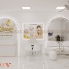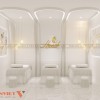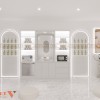 Điểm nhấn không gian là hệ thống gương được thiết kế dạng hình vòm, với các họa tiết đối xứng, tạo chiều sâu cho không gian. Gương không chỉ là một phần của trang trí mà còn có tác dụng làm tăng sự thoáng đãng và phản chiếu ánh sáng, giúp không gian thêm lung linh. Các chi tiết kim loại mạ vàng như viền gương, chân bàn, hoặc khung tranh tạo điểm nhấn sang trọng nhưng không quá phô trương.