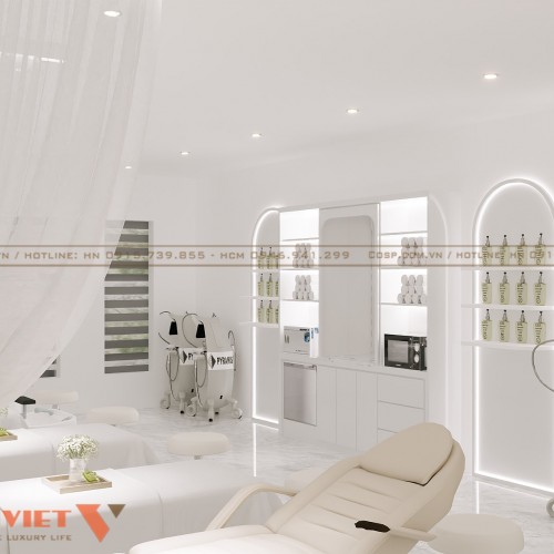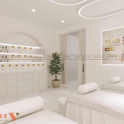 Mỗi giường spa được bọc nệm êm ái và bọc vải cao cấp màu trắng, đảm bảo sự thoải mái tối đa cho khách hàng. Đầu giường được thiết kế cong nhẹ, phù hợp với cơ thể, giúp khách hàng dễ dàng thả lỏng khi nằm. Dưới mỗi giường là vách tường có tủ đựng đồ được tích hợp thông minh, vừa tiện lợi cho nhân viên, vừa giữ cho không gian luôn gọn gàng.