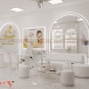 Quầy tiếp tân sử dụng gam màu trắng kết hợp viền vàng kim loại, vừa thanh lịch vừa hiện đại. Logo spa được đặt trong một khung vòm mềm mại, bao quanh bởi ánh đèn LED trắng dịu.