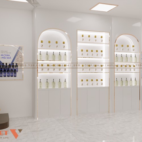 Bên cạnh đó, Hannah còn bố trí hệ giá kệ trưng bày mỹ phẩm, được chiếu sáng bằng hệ thống đèn LED gắn âm tường. Đây không chỉ là nơi trưng bày sản phẩm mà còn là một yếu tố trang trí độc đáo, thu hút ánh nhìn và khơi gợi sự tò mò của khách hàng.