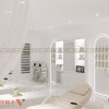 Các bộ bàn ghế tiếp khách mang kiểu dáng tối giản có đường cong mềm mại, tạo sự hài hòa với tổng thể. Ghế và sofa được bọc da màu trắng mịn màng, kết hợp với những chiếc bàn nhỏ có chân kim loại mạ vàng và mặt kính, tăng thêm vẻ tinh tế. Phía sau ghế là vách kính ốp tường đẹp mắt, vừa tạo điểm nhấn vừa có công dụng trang trí hiệu quả.